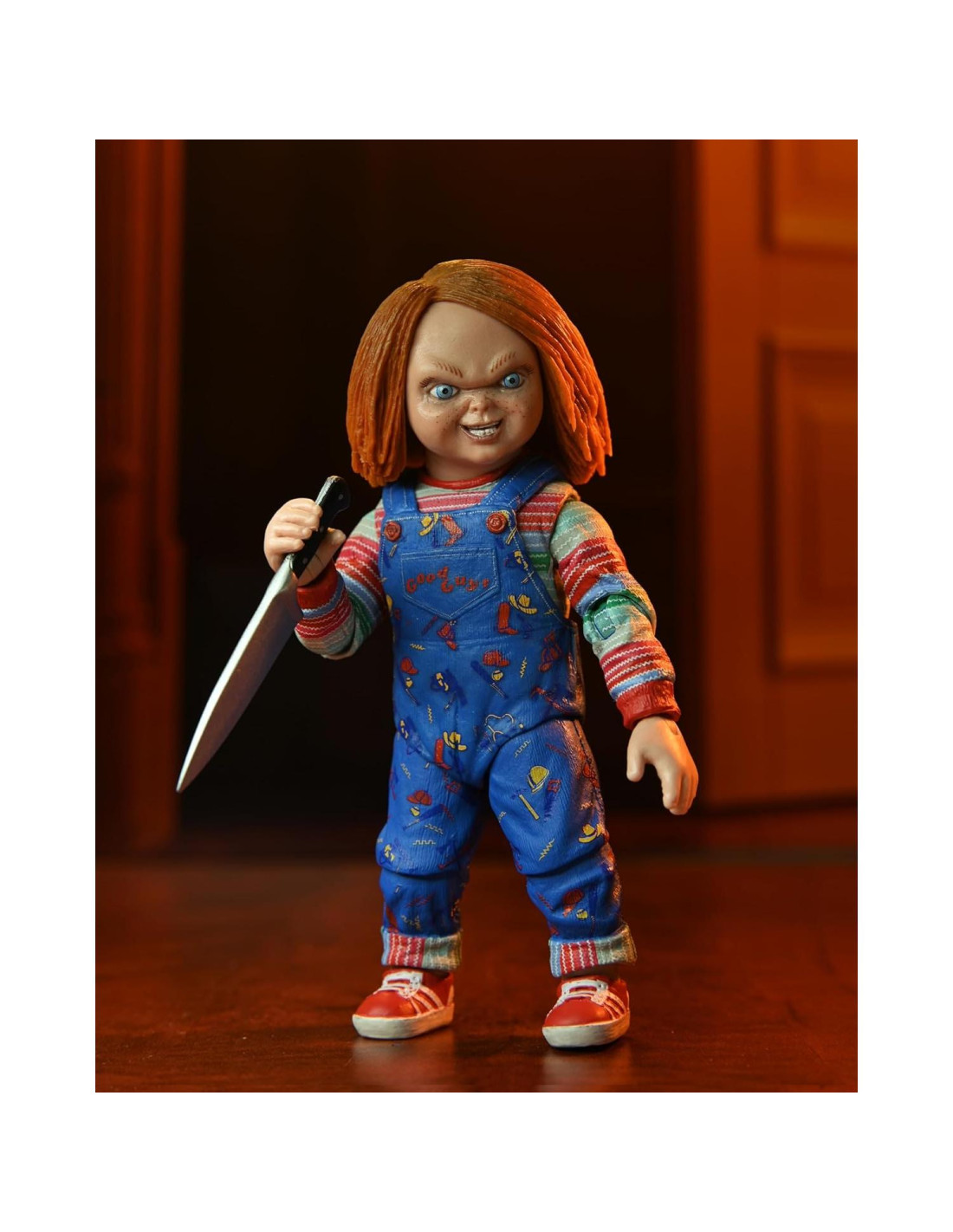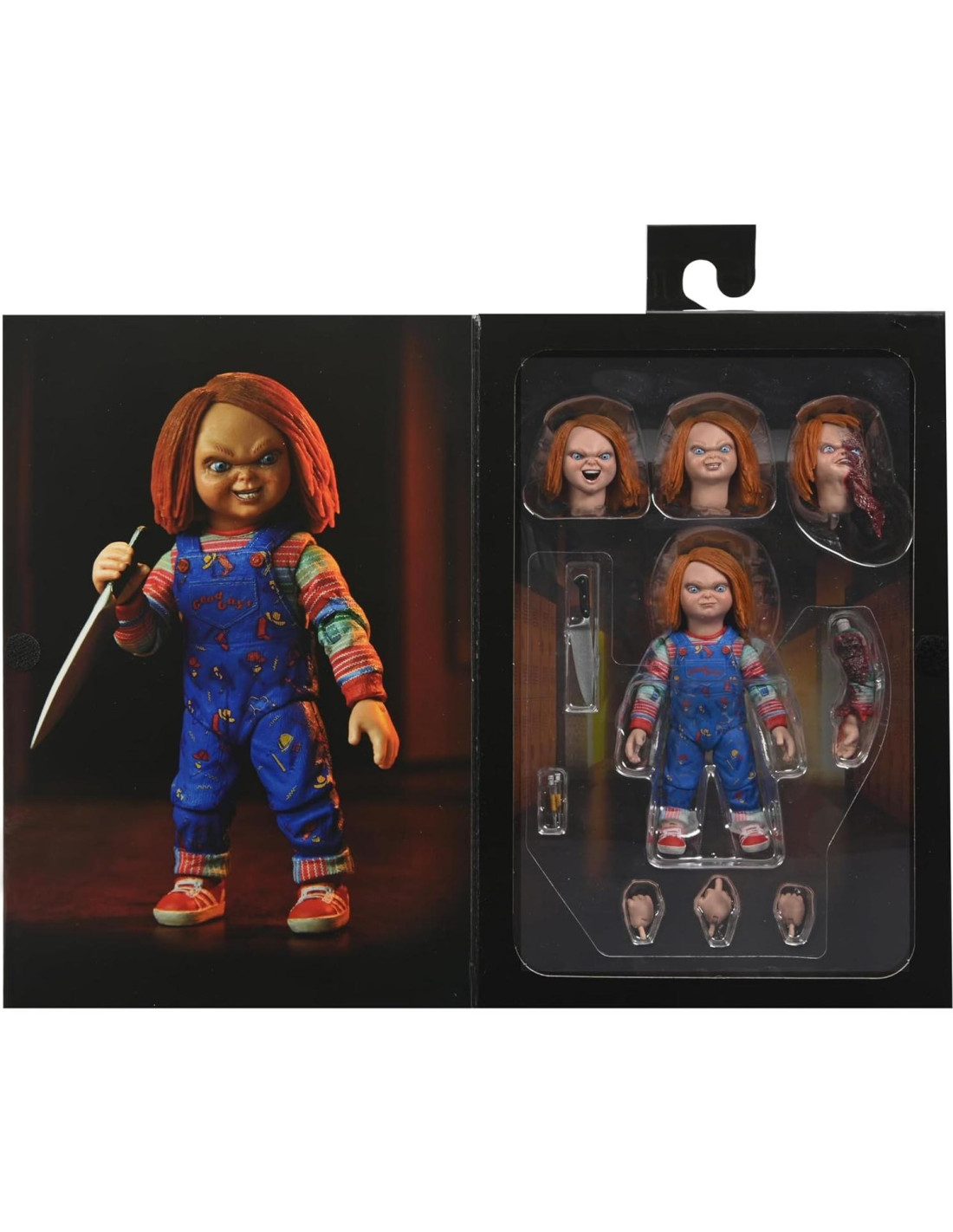 Chucky ha vuelto! Cuando una muñeca Chucky vintage aparece en una venta de garaje suburbana, un idílico pueblo americano se sumerge en el caos mientras una serie de horripilantes asesinatos comienza a exponer las hipocresías y secretos del pueblo. Esta figura de acción Ultimate representa a la muñeca asesina, habitada por el alma de un asesino en serie, como se ve en la nueva serie de televisión "coming of rage", CHUCKY. Incluye cuatro cabezas intercambiables, manos intercambiables, cuchillo de carnicero, paquete de jeringas y un brazo quemado intercambiable. Esta figura mide 10.16 cm (4") de altura con más de 15 puntos de articulación. Viene en un empaque de caja de ventana deluxe amigable para coleccionistas con solapa de apertura.