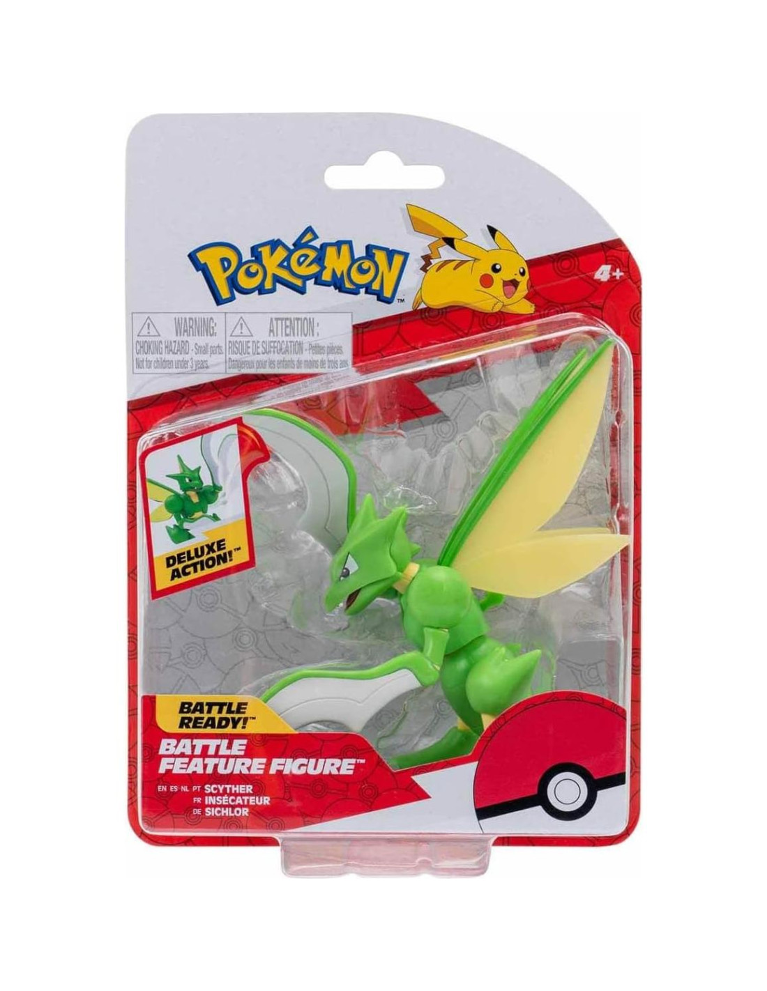 Elige a Scyther, el Pokémon Mantis. Con numerosos puntos de articulación y dos brazos de ataque de corte, esta figura de 4.5 pulgadas (11,43 cm) está hecha para jugar y exhibir. Fue diseñada con detalles auténticos y parece que voló directamente de la Serie Animada de Pokémon. Agrega a Scyther a tu equipo de Pokémon y mantente atento a más Figuras de Batalla. Producto oficial de Pokémon de Jazwares. Edades 4+ Incluye: (1) Figura de Batalla de Scyther de 4.5 pulgadas (11,43 cm) Edades: 4+