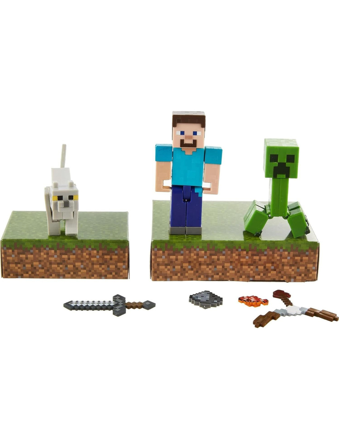 ¡Steve y el Gato tienen el poder de ahuyentar al malvado Creeper, los fanáticos de Minecraft decidirán mientras continúan creando, explorando y sobreviviendo en el mundo real! Las Figuras del Paquete de Aventura Creeper Asustado permiten a los fanáticos de Minecraft imaginar nuevas historias de combate y supervivencia. ¡Los fanáticos deciden si el personaje favorito de Minecraft, Steve, con la ayuda del Gato y armado con las armas incluidas, puede derribar al Creeper! El paquete de aventura completo incluye figuras de Steve, Gato y Creeper en escala de 3.25 pulgadas (8.26 cm), armas, accesorios y bloques de papel para crear terreno extra. ¡Otros conjuntos de historia disponibles, se venden por separado. Los colores y decoraciones pueden variar.