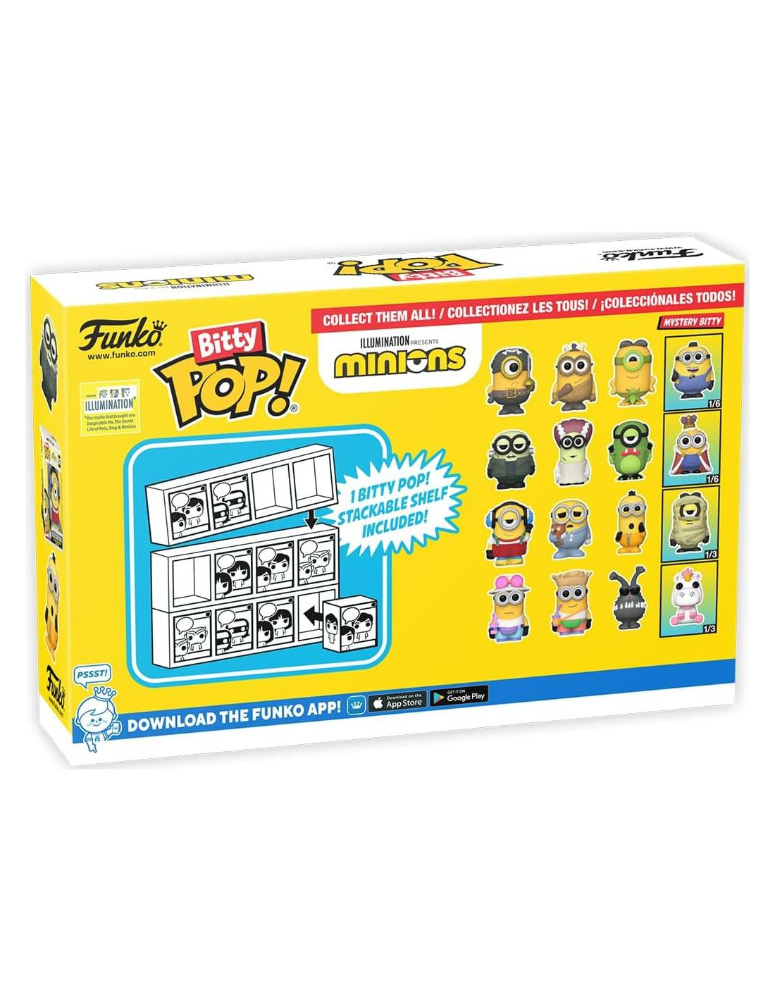 ¡Tus Pops! favoritos han sido reducidos a Bitty Pops! Expande tu colección de Minions con este surtido de figuras Bitty Pop! que presentan a tus malvados minions más queridos. Este paquete de 4 incluye a Bitty Pop! Turista Dave, Bitty Pop! Turista Jerry, Bitty Pop! Kyle y una figura Bitty Pop! misteriosa. Las posibles figuras Bitty Pop! misteriosas son el Rey Bob Hiper Raro (1/6), Otto Pet Rock Hiper Raro (1/6), Stuart Momia Raro (1/3) y Fluffy Raro (1/3). Los Bitty Pops! vienen empaquetados en cajas de acrílico duro con tapas inferiores desmontables. Las tapas inferiores desmontables también sirven como bases de acrílico, a las que se adhieren las figuras Bitty Pop!. ¡Clasifica y organiza tus Bitty Pops! con la caja de exhibición incluida! Las cajas de exhibición de acrílico son apilables y sostienen cuatro figuras Bitty Pop! cada una. Las figuras de vinilo tienen aproximadamente 0.9 pulgadas de altura. Cuatro figuras por compra de paquete individual. Advertencia: Peligro de asfixia. Los coleccionables son pequeños. No apto para niños menores de 3 años. La selección de artículos es aleatoria, ya que cada pieza está en un empaque ciego. No podemos aceptar solicitudes para artículos específicos. Puede recibir figuras duplicadas.