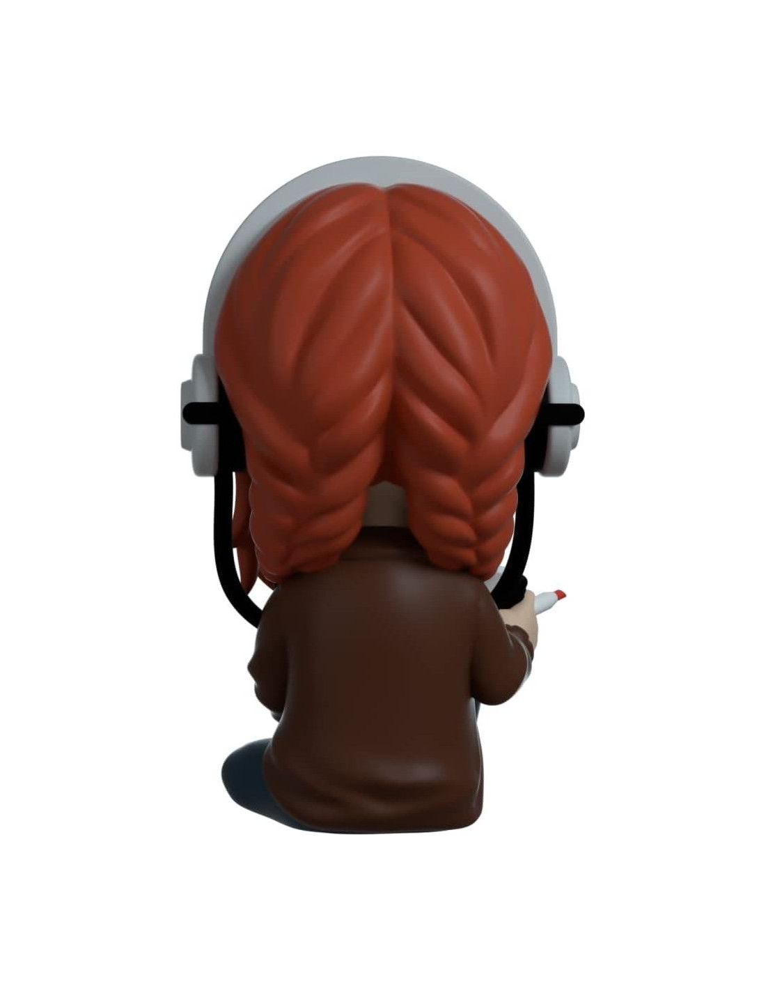 ¿Viernes de película? ¡Presentamos a Max Mayfield en la colaboración de Youtooz x Stranger Things! Max posa sentada en el suelo, con las piernas dobladas en las rodillas, su derecha apuntando hacia arriba y su izquierda hacia los lados. Ella tiene el cabello rojo recogido en dos trenzas con algunos mechones sueltos alrededor de su cara. Tiene un ligero rubor en su rostro y se ven pecas mientras esboza una amable sonrisa. Ella está vestida con una chaqueta marrón y jeans azules con una camiseta verde que combina con calcetines verdes y blancos. Cubre tus oídos con auriculares negros y blancos. Ella tiene su mano izquierda apoyada en su pie izquierdo y la derecha sostiene un cuaderno con un dibujo de ella y Lucas juntos en el cine. El exterior de su envoltura de doble pared muestra a Lucas y a ella sentados dentro de la casa, hablando entre sí con sus cuadernos. El interior es un fondo negro en el que parece reflejarse una sustancia viscosa. Este coleccionable viene en una caja protectora mate con relieve y un protector de plástico personalizado para protegerlo al máximo durante el envío.