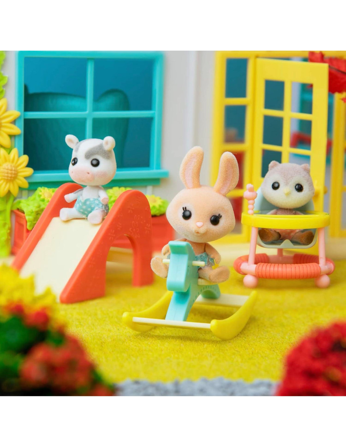 Conoce a los bebés en Honey Bee Acres que aman jugar y tener sus divertidos juguetes! Cada figura poseable de felpa lleva un pañal de colores brillantes para un divertido juego de moda! ¡El Bebé Binx ama columpiarse; todo lo que necesita es un buen empujón! El Bebé Sadie tararea una canción mientras monta su caballito de madera, y el pasatiempo favorito del Bebé Moo es deslizarse por el tobogán una y otra vez! El Bebé Ollie finge que su cuna es un barco, mientras que el Bebé Hooty gira en su asiento saltarín! No podemos olvidar al Bebé Georgie, que siempre tiene hambre y nunca deja su silla alta! Y luego está el Bebé Mimi, que ama pasear en su cochecito acogedor y el Bebé Lucky en su carreta siempre que lo ayudes a empujar o tirar de ellos! ¡Estos bebés siempre están felices, haciendo que cada día sea un día especial en Honey Bee Acres!