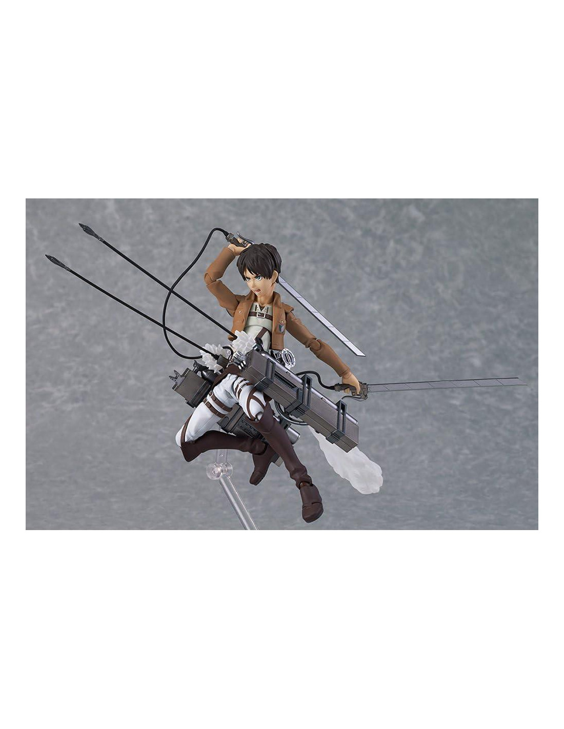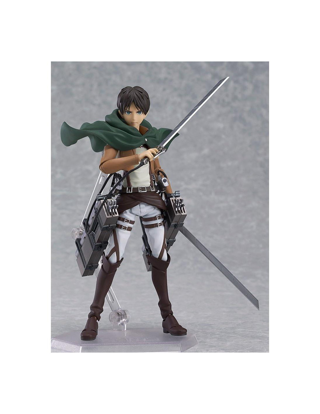 Del fabricante de Max Factory/Good Smile Company. "El contraataque de la humanidad comienza ahora." De la serie de anime Ataque a los Titanes viene un figma del personaje principal de la serie, Eren Yeager. Usando las articulaciones suaves pero posables del figma, puedes representar una variedad de escenas diferentes. Viene con tres expresiones que incluyen su cara determinada estándar, una cara enojada y una cara sorprendida. Sus dos espadas están incluidas para escenas de combate, junto con su Equipo de Maniobra Vertical y efectos de humo para recrear su uso. Los ganchos conectados a un cable que sale del equipo también están incluidos, junto con su manto de la Legión de Exploración. Se incluye un soporte articulado de figma, que permite tomar varias poses.