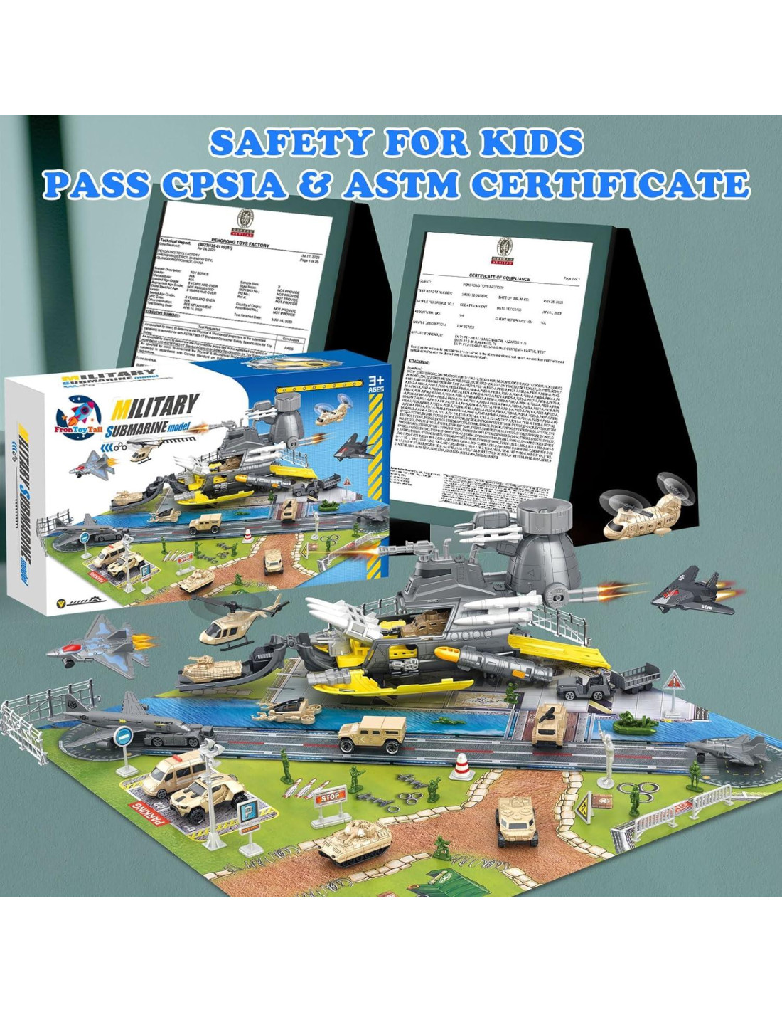 - Juego de Juguetes de Base Militar: Los juguetes militares incluyen submarino, coches de vehículos del ejército, camión militar, helicóptero militar, avión militar, juguete de caza, vehículo explorador, tanque del ejército, coche blindado, obstáculos, cercas protectoras, mapas, figuras de mini soldados, etc.