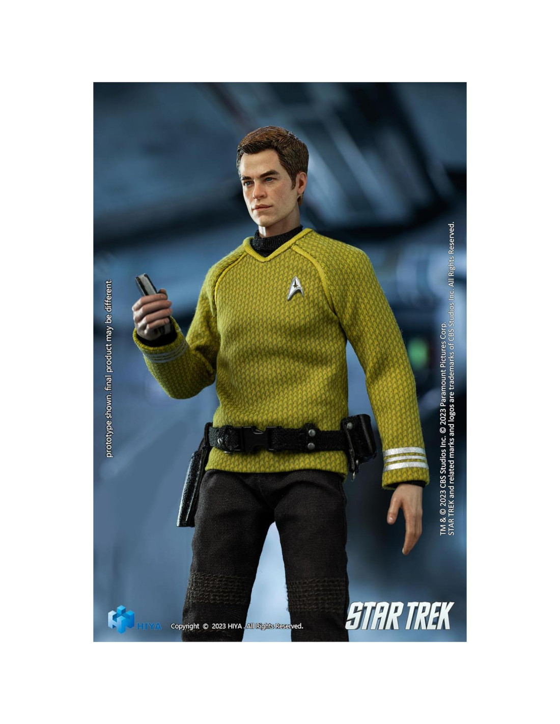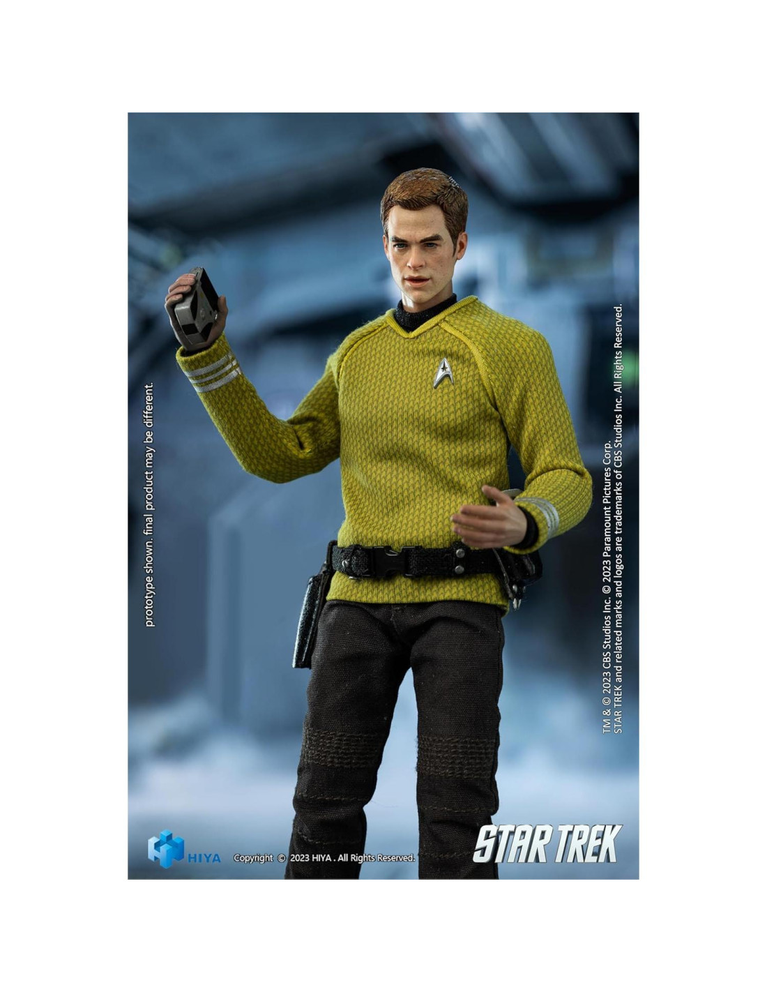 De Hiya Toys. ¡Una exclusiva de PREVIEWS! Hiya Toys se enorgullece de anunciar la nueva entrega de la serie EXQUISITE SUPER a escala 1/12: ¡James T. Kirk de Star Trek 2009! Esta nueva figura de acción de James T. Kirk mide 15.7 cm (6.2 pulgadas) de altura y reproduce fielmente su apariencia de la película. Lleva el icónico uniforme amarillo con el emblema de Starfleet que representa al personal de mando y estratégico. Su ropa, jeans y cinturones están hechos de tela real, asegurando tanto una superior capacidad de pose como un atractivo estético. Su comunicador, pistola phaser, grabadora de voz, cantimplora de whisky y otros accesorios están finamente detallados, y junto con las piezas intercambiables, ¡los fanáticos pueden recrear varias poses de acción dinámicas! También se incluye un soporte especial para esta serie, que presenta una base negra adornada con el logo de Star Trek, sumergiéndote completamente en la atmósfera del universo de Star Trek.