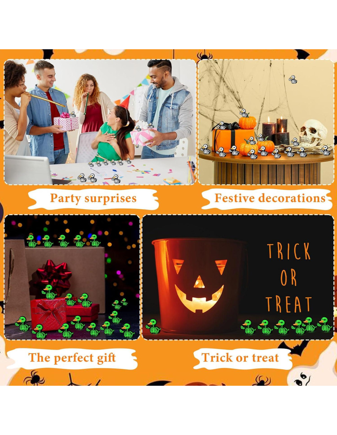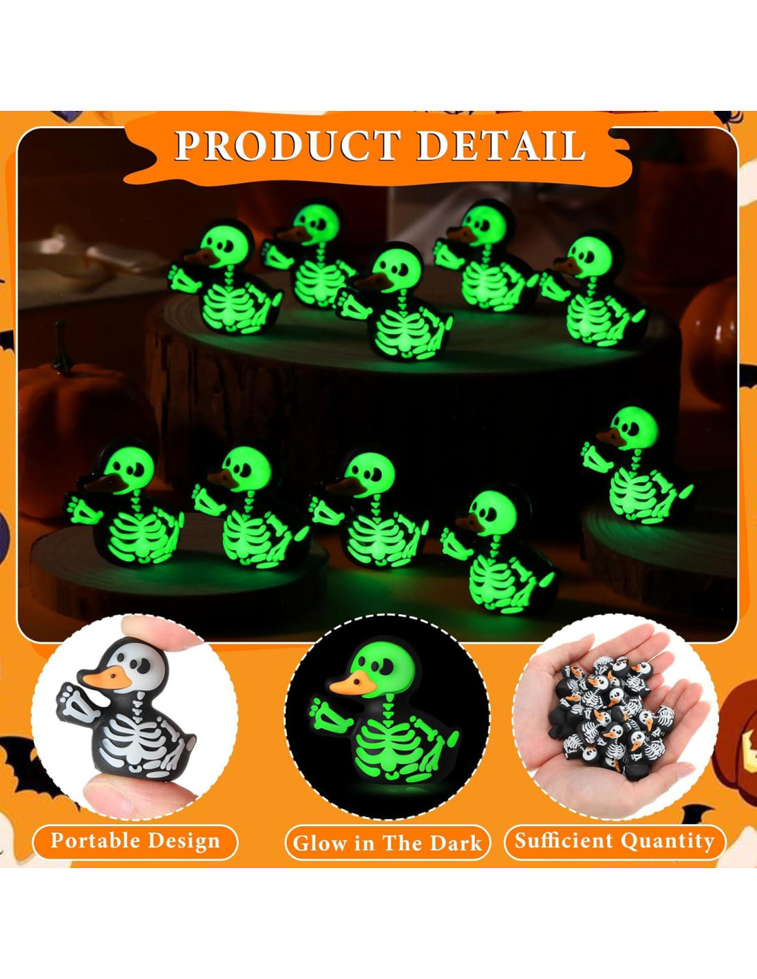 - Diseño Delicado y Cautivador: Los juguetes de calaveras de patito presentan un llamativo contraste en blanco y negro, con contornos esqueléticos meticulosamente detallados. Durante el día, estas espeluznantes calaveras son visualmente intrigantes; por la noche, su brillo revela un encanto fantástico. Fabricadas en plástico, cada figura asegura una exhibición inquietantemente hermosa.