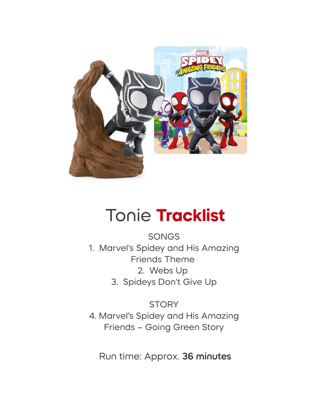 Cuando Spidey y Spin se encuentran con Black Panther en el parque para plantar árboles, inesperadamente se topan con Green Goblin y su super apestoso Goblin Gas! Gobby está rociando los horribles vapores por todas partes, causando que todas las personas y animales huyan del parque. Ahora los héroes deben encontrar una manera de detener a Green Goblin, deshacerse del Goblin Gas y hacer que el parque sea seguro para todos nuevamente - y plantar esos árboles! Tiempo total de ejecución es aproximadamente 36 minutos. Canciones: 1) Tema de Spidey y sus increíbles amigos de Marvel, 2) Webs Up, 3) Spideys No se Rinden. Historia: 4) Spidey y sus increíbles amigos de Marvel - Historia de Ir Verde. Un Tonie para Todos. Los Tonies son personajes que presentan contenido, historias y canciones de una colección en constante crecimiento de favoritos modernos y clásicos atemporales. Cambiar historias es tan simple como cambiar el Tonie en tu Toniebox. Con socios como Disney, DreamWorks, GoNoodle y Sesame Workshop, es una colección llena de variedad. La biblioteca de contenido de Tonies presenta historias y canciones mientras también se enfoca en lecciones educativas, ejercicios de atención plena, ayudando a la siesta y rutinas, y creando tu propio contenido con Creative-Tonies. La Toniebox se vende por separado y es un nuevo sistema de audio diseñado para pequeños oyentes. ¡Enciéndelo, coloca un Tonie en la parte superior y deja que la aventura de audio comience! Los Tonies brindan a tu familia una experiencia sin pantallas, que fomenta la imaginación, a diferencia de cualquier otra, y cada Tonie trae nuevas historias o canciones!