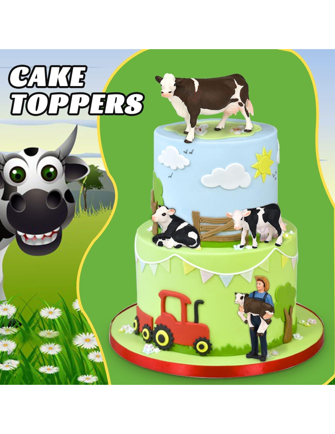- Material Seguro y de Alta Calidad con Tamaño Adecuado: Estas figuras de animales de vaca para decoración de tartas están hechas de materiales de alta calidad, con aprobación ASTM, CPSIA, EN71, materiales altamente duraderos que son seguros para niños y adultos. Úsalas sin preocupaciones en cupcakes, tartas de cumpleaños de granja y más. El tamaño de cada figura es 5.18" (13,12 cm) * 2.95" (7,49 cm) de altura para la vaca Simmental, 2.2" (5,58 cm) * 1.49" (3,78 cm) para el ternero Holstein acostado, 2.67" (6,78 cm) * 1.92" (4,88 cm) para la figura de ternero Holstein, 1.81" (4,59 cm) * 3.74" (9,50 cm) para el granjero con ternero. Funcionan mejor en tartas de 8-12 pulgadas (20,32-30,48 cm) o cupcakes regulares.