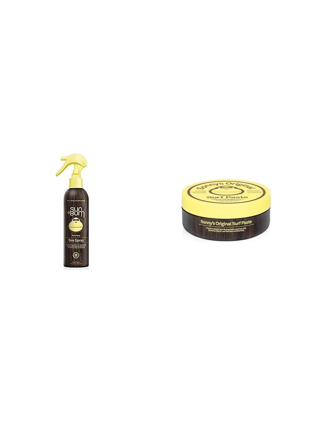 Spray de Mar Sun Bum | Spray de Sal de Mar Texturizante y Voluminizador | Protección UV con Acabado Mate | Sujeción Media | Para Todos los Tipos de Cabello | Botella de 6 FL OZ (177.44 ml) (80-41025) El Spray de Sal de Mar Texturizante Sun Bum para el cabello protege tu cabello de los elementos mientras le da cuerpo, ondas y textura extra para ese aspecto despeinado por el viento de la playa. Nuestra fórmula ligera mejora la separación y definición de las hebras, bloqueando instantáneamente la humedad que causa el frizz. Le dará a tu cabello justo la cantidad adecuada de volumen con una sujeción de acabado mate. Enriquecido con sal marina negra de lava hawaiana, algas y kelp, mantendrá tus mechones luciendo y sintiéndose saludables. Este Spray de Sal de Mar es seguro para el color y se puede usar en todos los tipos y texturas de cabello. Como un bono adicional, este spray para el cabello de sal marina ofrece protección contra los dañinos rayos UV que previenen que tu cabello se vuelva opaco, quebradizo y descolorido. ¡Los amantes del sol se regocijan! Pasta Original de Surf de Sonny de Sun Bum Sí, nos gusta lucir bien, pero realmente no nos gusta pasar demasiado tiempo preocupándonos por ello. Así que hicimos la Pasta Original de Surf Texturizante de Sonny, que le da a nuestras melenas un acabado suave y mate para un aspecto y sensación casual que nos gusta. Haz menos, vive más. La Pasta para Cabello Original de Sonny está destinada para uso diario para texturizar y estilizar el cabello mientras ofrece Protección UV. Está enriquecida con Sal Negra Hawaiana, Sal de Mar y Kelp de Mar.