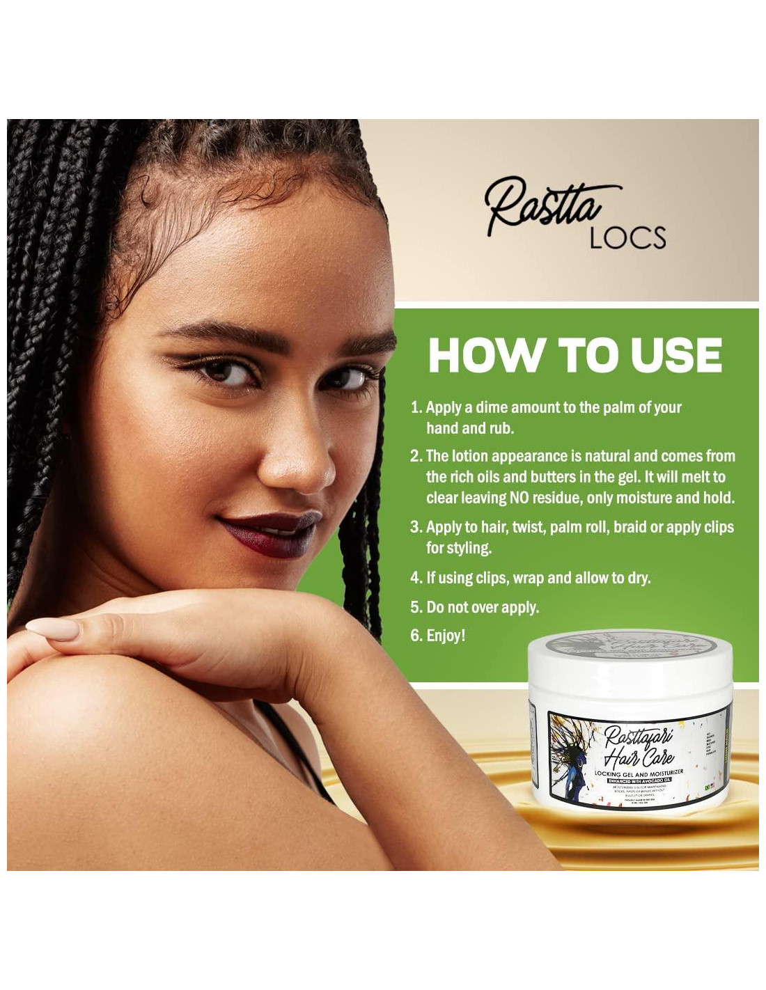 - NO ES TU GEL DE FIJACIÓN PROMEDIO. A diferencia de la mayoría de los geles de peinado de fijación, nuestro gel ha sido especialmente formulado para ser ligero y no pesado, por lo que no deja residuos en tus dreadlocks. Te encantará cómo se siente este gel en tus dedos así como en tu cabello.
