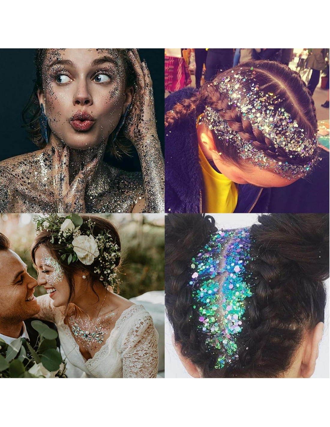 - Conjunto de Gel de Brillo Terrífico: 2 tarros por set de gel de brillo corporal, un total de 120ML, Mezclas de Brillo Corporal Grueso con muchas formas y tamaños diferentes de brillos gruesos y finos en una base de gel, ideal para una cobertura metálica con un efecto holográfico. Los brillos de lentejuelas tienen colores vibrantes, que aparecen como un brillo ultra reflectante y brillante.