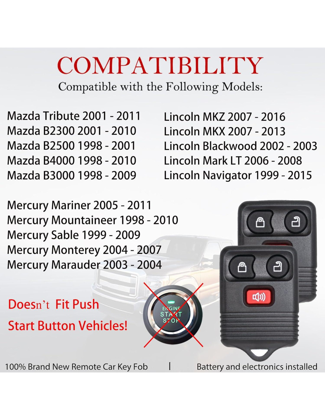 - COMPATIBILIDAD: Con reemplazo de llavero remoto para Ford F-100/F-150/F-250/F-350/F-450/F-550/Flex/Expedition/Edge/Escape/Excursion/Escort/Explorer/Econoline/E-150/E-250/E-350/E-450/E-550/Focus/Fusion/Freestar/Ranger/Windstar/Taurus X | Para Mazda Tribute/B2300/B2500/B4000/B3000 | Para Mercury/Lincoln. Para verificar, puede consultar la herramienta de ajuste de vehículo arriba y la descripción para una coincidencia exacta.