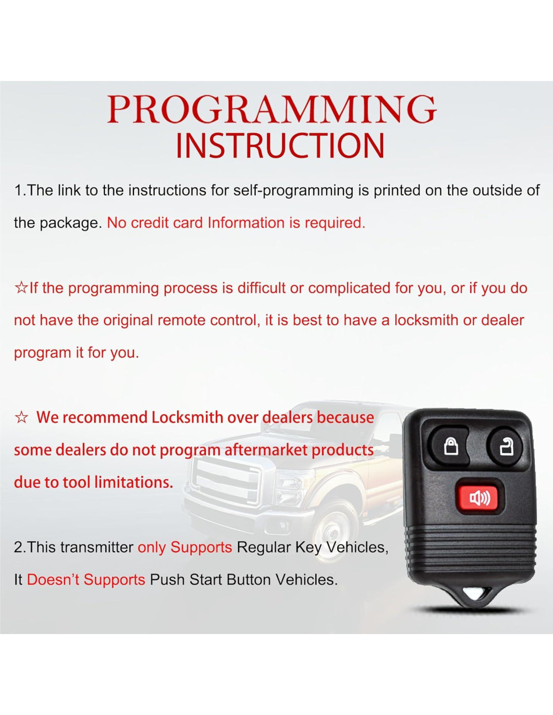 - PROGRAMACIÓN: El enlace de instrucciones para la auto-programación ya está impreso en el exterior del paquete, no se requiere información de tarjeta de crédito. Si el proceso de programación es difícil o complicado para usted, o si no tiene el control remoto original, es mejor que un cerrajero o concesionario le ayude a programarlo.