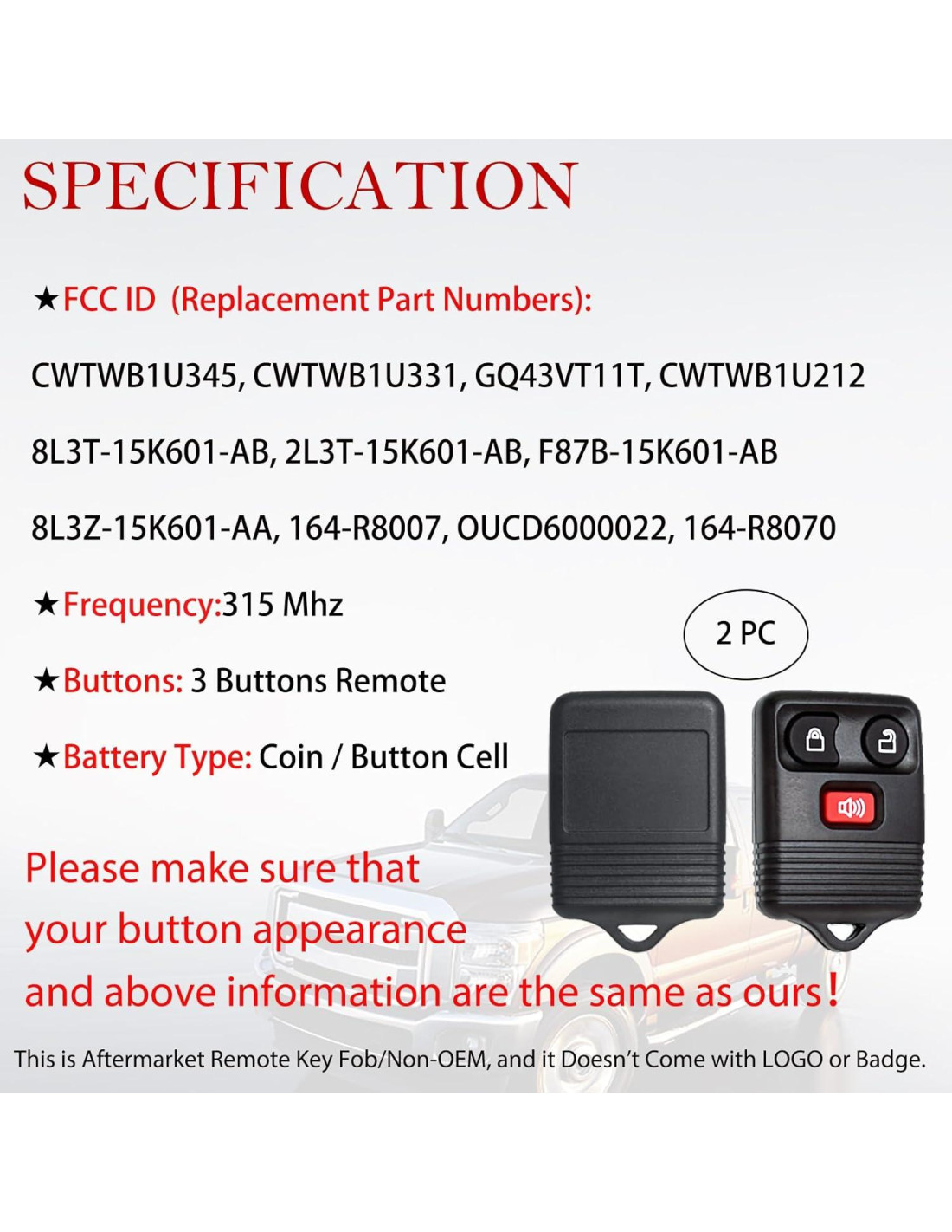 - REEMPLAZO: Para control remoto de entrada sin llave ID FCC (Números de parte): CWTWB1U345, CWTWB1U331, GQ43VT11T, CWTWB1U212, 8L3T-15K601-AB, 2L3T-15K601-AB, F87B-15K601-AB, 8L3Z-15K601-AA, 164-R8007, OUCD6000022, 164-R8070. Frecuencia: 315Mhz.