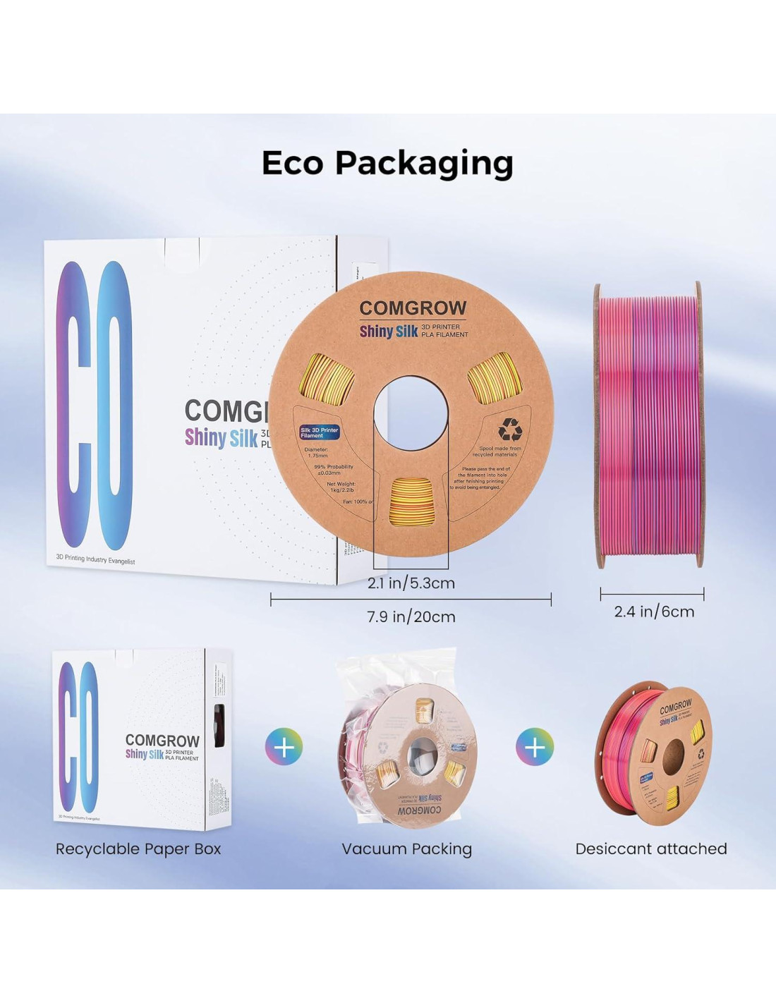 - Embalaje ECO-En lugar de carretes de plástico, utilizamos carretes de papel y cajas de papel para empaquetar el filamento de Seda PLA. El filamento Rainbow PLA está empaquetado al vacío con un deshidratante de alta calidad para mantenerlo seco, a prueba de polvo y de alto rendimiento durante mucho tiempo.