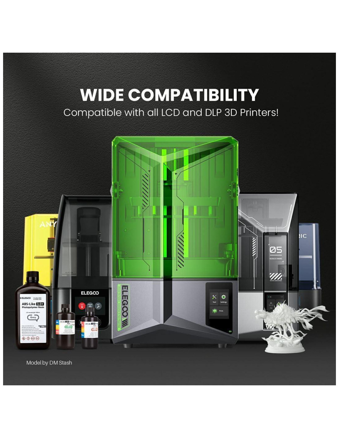 - Amplia Compatibilidad: Compatible con la mayoría de las impresoras 3D LCD/DLP que utilizan tecnología de fuente de luz UV de 405nm. Logra resultados óptimos cuando se utiliza con impresoras 3D UV ELEGOO.
