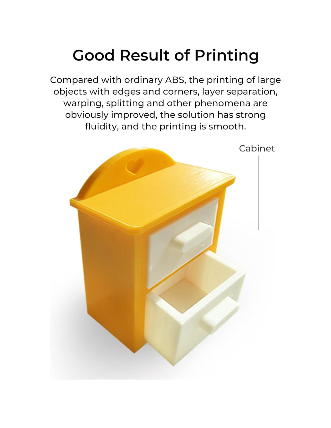 - Buen resultado de impresión: En comparación con el ABS ordinario, la impresión de objetos grandes con bordes y esquinas, separación de capas, deformación, agrietamiento y otros fenómenos se mejoran notablemente, la solución tiene una fuerte fluidez y la impresión es suave