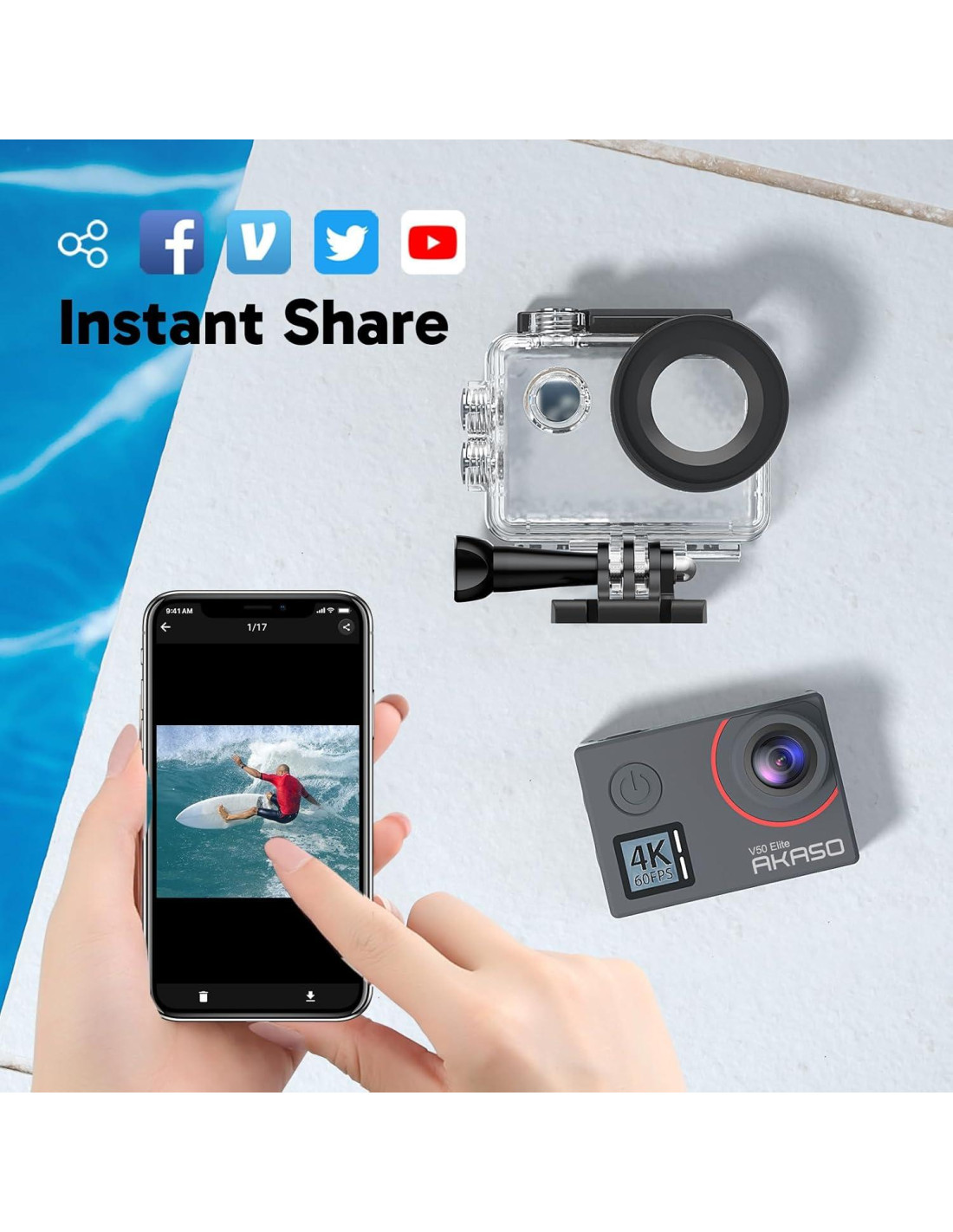 Graba videos impresionantes con una resolución de hasta 4K60, perfecto para mantener el detalle incluso al hacer zoom. Con la carcasa a prueba de agua, puedes sumergirte hasta 40m (131 pies) para descubrir el increíble mundo submarino. Puedes controlar esta cámara de acción manos libres con comandos de voz como 'Foto de Acción'. Captura una mayor variedad de tomas con mayor flexibilidad. Con el micrófono externo AKASO (no incluido), la cámara captura sonido con detalles nítidos. El control remoto realmente puede dejar tus manos libres. Te permite controlar la cámara desde una distancia. Configurar, previsualizar y grabar es más fácil que antes con la pantalla táctil intuitiva. Captura hasta 30 fotos por segundo, congelando el tiempo y preservando cada momento precioso. Puedes ajustar el ángulo de visión de esta cámara de acción según tus necesidades. Puedes conectar la cámara a tu teléfono. La aplicación AKASO GO ayuda a editar y transferir tus contenidos. Con la video de ultra alta velocidad de 720P240, puedes ralentizar las cosas hasta 8 veces para revivir momentos divertidos, interesantes o épicos en toda su gloria. La estabilización electrónica de imagen avanzada (EIS) incorporada permite que tu cámara de acción V50 Elite entregue videos estables y suaves al grabar objetos en movimiento rápido. La estabilización de imagen se desactiva cuando seleccionas 4K 60FPS, 2.7K 60FPS, 1080P 120FPS o todas las resoluciones de video 720P. Crea videos de lapso de tiempo cautivadores. Condensa horas o incluso días en momentos hipnotizantes, revelando una perspectiva única sobre el paso del tiempo.