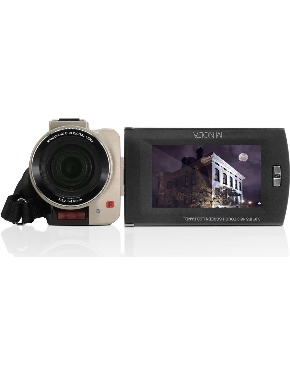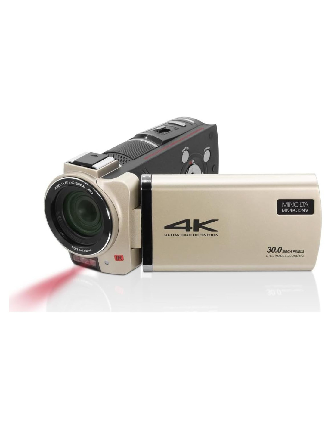 La cámara de video MN4K30NV de Minolta graba contenido en video en 4K Ultra HD y captura fotos en resolución de 30 Mega Píxeles. Cargada de características, incluye un zoom digital de 16x, estabilización contra sacudidas, detección de rostros y una pantalla táctil LCD de alta resolución de 3.0" (7.62 cm). Su capacidad de Visión Nocturna utiliza un sensor infrarrojo avanzado que ilumina la escena en condiciones de poca luz. Agrega fácilmente accesorios con el soporte de zapata de accesorios integrado. Incluido en el paquete hay un adaptador de CA, batería de Li-ion, control remoto y tarjeta SD de 32GB para horas de grabación y cientos de fotos.