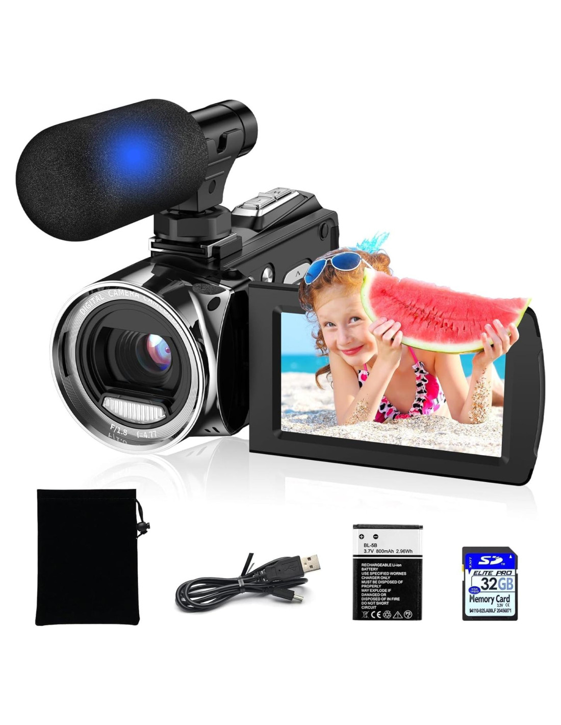 - [Usar al Abrir la Caja] El paquete de la cámara de video digital incluye micrófono con cable de 3.5mm, tarjeta de memoria SD de 32GB, baterías recargables, bolsa de transporte, cable USB, manual del usuario. Solo úsala para grabar video una vez que abras la caja, nada más que necesites pagar. Regalo ideal para vacaciones y cumpleaños para niños, adolescentes, estudiantes y otros principiantes en fotografía.