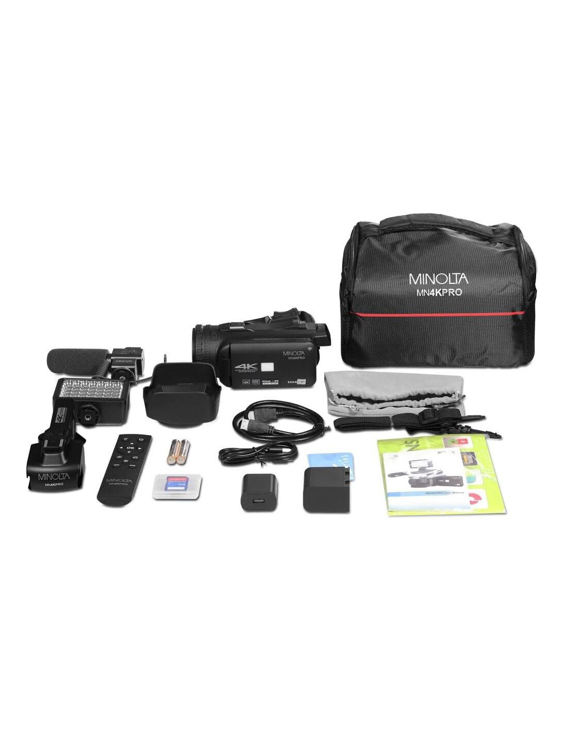 - El paquete incluye: Kit de videocámara Minolta MN4KPRO UHD 4K60 Autofocus Pro + 2x 128GB Tarjeta de Memoria SDHC/SDXC UHS-I + Trípode de Cámara de 72" + Kit de limpieza + Billetera de tarjeta de memoria + Lector de tarjeta USB, SD/microSD + Corel Photo, Video, & Art Suite Deluxe