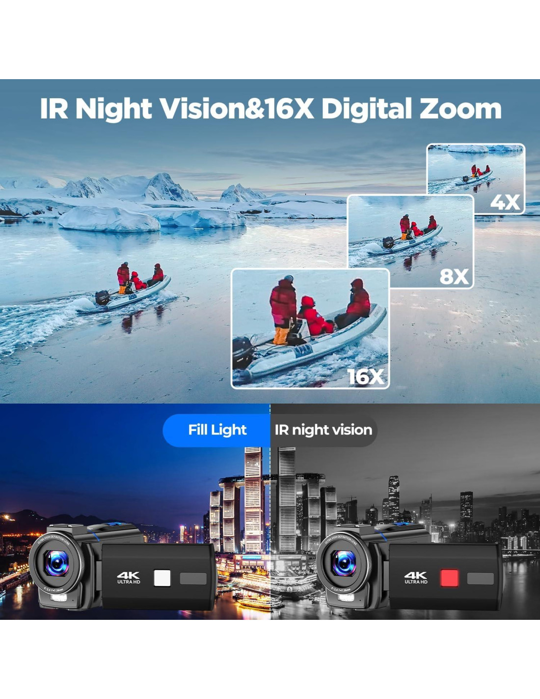 - Pantalla Táctil de 3.0" & Visión Nocturna IR: En comparación con otros, este equipo de cámara de video camcorder 4k tiene una pantalla táctil de 3.0 pulgadas con rotación de 270 grados, lo que es más conveniente para cambiar parámetros y ofrece más opciones de ángulos de disparo. Con la función de visión nocturna IR, puedes capturar fotos o videos en blanco y negro en entornos poco iluminados o oscuros. Además, la luz de relleno LED incorporada mejora tus tomas en condiciones de poca luz y de noche