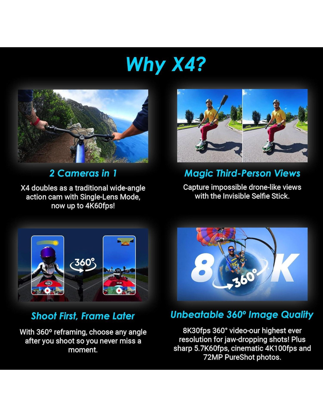 - Artículos del paquete incluidos - 1 x Insta360 X4 - Cámara 360 Impermeable con Sensor de 48MP de 1/2", Video 5.7K 360, Foto 360 de 72MP, Estabilización, Pantalla Táctil de 2.5", Edición AI, Transmisión en Vivo, 1 x Tarjeta Micro SDXC Extreme Pro de 64GB, 1 x Kit de Accesorios de 50 Piezas, 1 x Lector de Tarjetas de Memoria, 1 x Montaje Adaptador, 1 x Kit de Limpieza