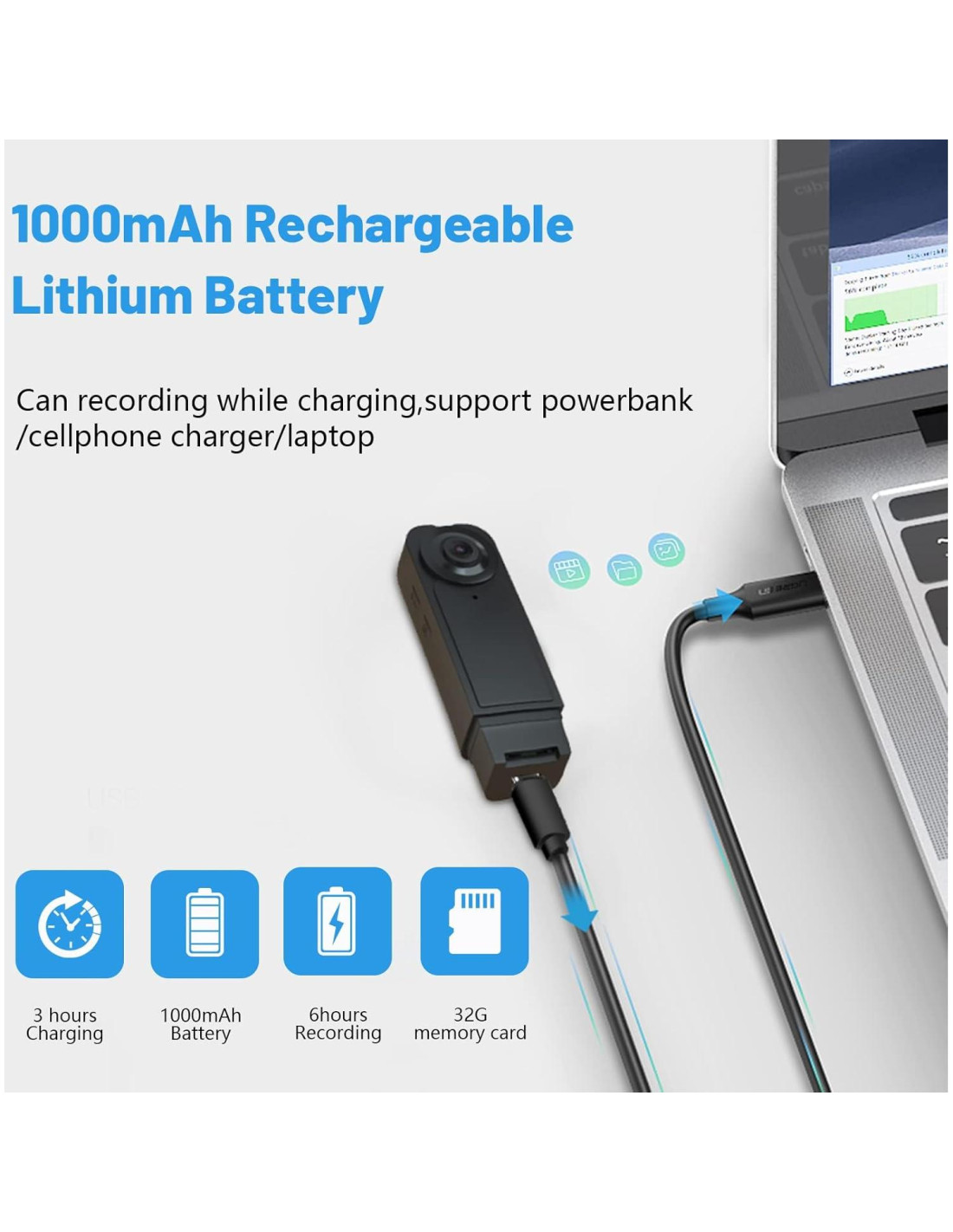 - 360 Minutos de Trabajo y Almacenamiento en Bucle: Nuestra pequeña cámara de video tiene una batería recargable de 1200 mAh incorporada, que puede durar hasta 360 minutos después de estar completamente cargada. También admite grabación en bucle a largo plazo cuando está conectada a la fuente de alimentación (grabando video mientras se carga)