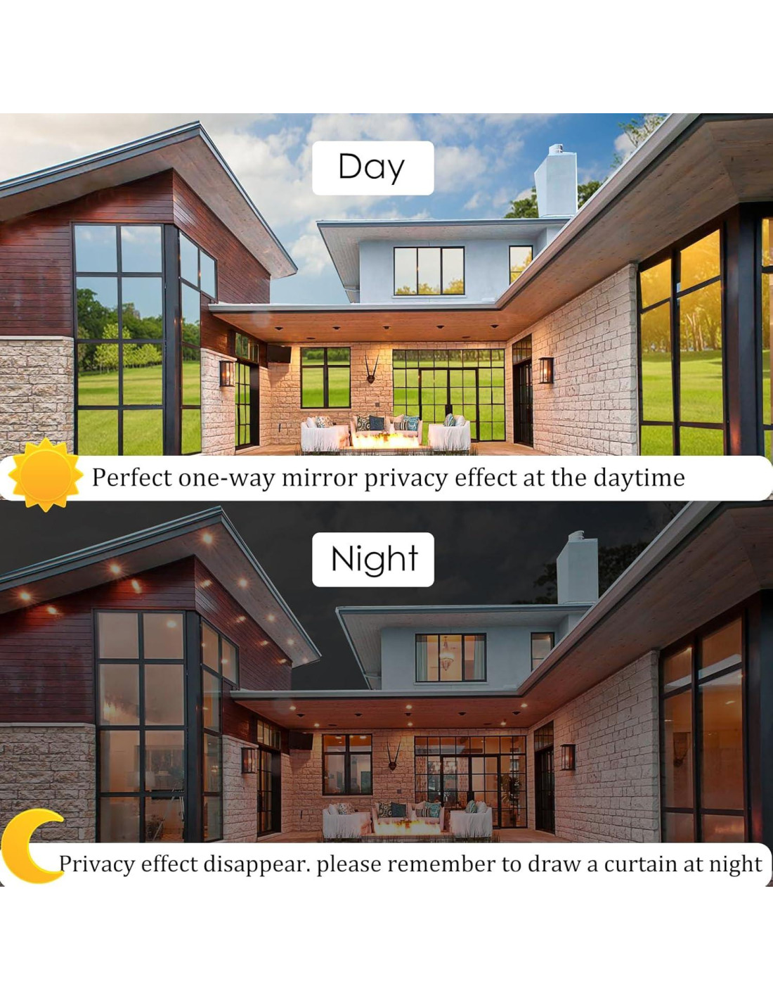- PROTECCIÓN DE PRIVACIDAD - Apariencia exterior espejada proporciona privacidad diurna de una vía (cuando el sol se pone y las luces están encendidas dentro, la película ya no oculta las vistas)