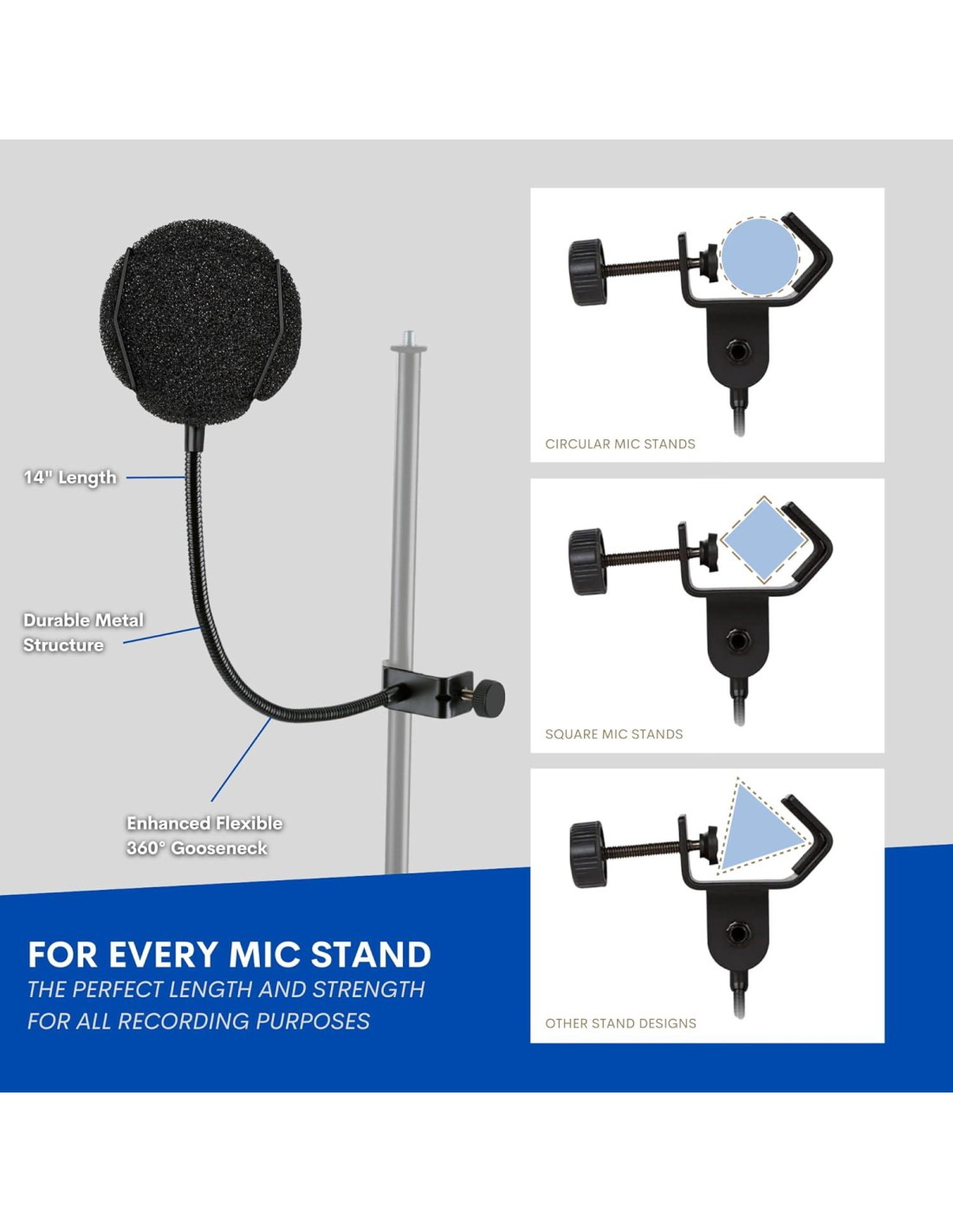 - Gooseneck Ajustable - La pantalla de malla pop tiene un brazo estabilizador de clip flexible de 360 grados que puede soportar su propio peso y es lo suficientemente fuerte como para sostener el soporte del micrófono.