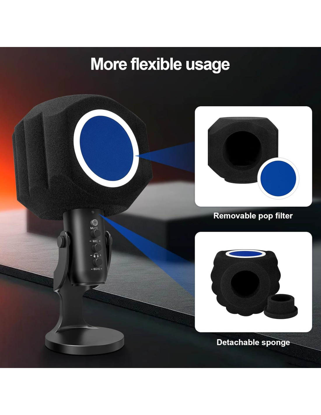 - Tratamiento acústico: El escudo de aislamiento del micrófono permite reducir el rebote de las ondas de audio y la interferencia al grabar. Te ayuda a producir un sonido más limpio y mejorar la claridad del sonido, permitiéndote reducir el procesamiento de audio