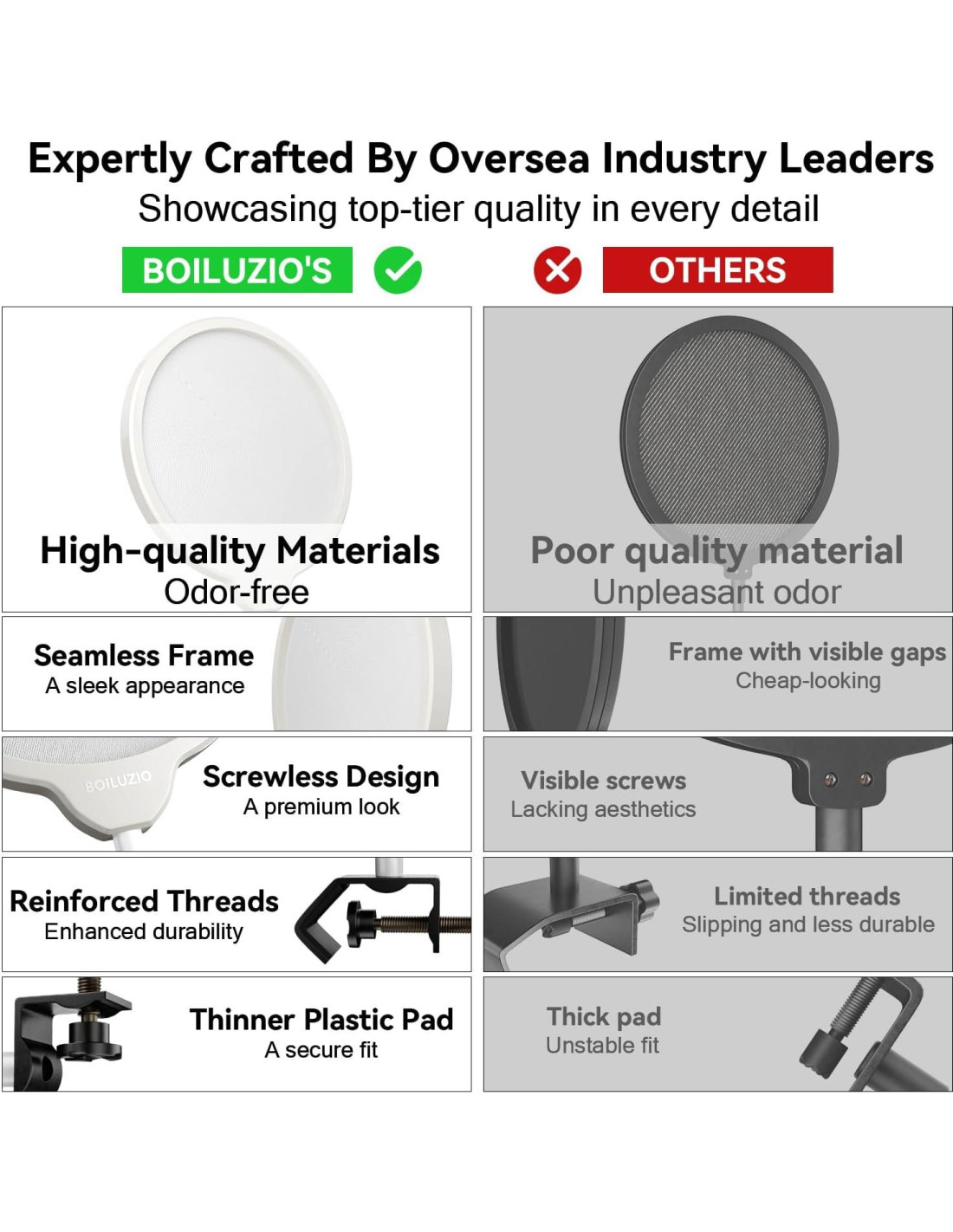 Filtro Pop Profesional BOILUZIO, ¡Desata el Carisma en Tu Voz! ¿Por qué usar un filtro pop? 1. Un filtro pop previene la ocurrencia de sonidos explosivos (como los sonidos "P" y "B") durante la grabación, reduciendo el impacto del flujo de aire oral en el micrófono y minimizando el ruido. Esto ayuda a asegurar grabaciones más claras y reduce la distorsión y la interferencia de audio innecesarias. 2. Protege tu micrófono de la saliva, asegurando limpieza y longevidad. Los residuos de saliva en el micrófono pueden erosionarlo gradualmente, llevando a daños permanentes. ¿Por qué elegirnos? Colaboramos con socios de primer nivel y expertos de la industria con décadas de experiencia para crear un producto líder. La satisfacción del cliente es nuestra prioridad, y buscamos superar las expectativas con productos de alta calidad. ¿Por qué elegir este filtro pop? Más allá de sus ventajas funcionales, nuestro producto cuenta con un diseño premium y elegante, elevando tu entorno de grabación o habla a un nivel sofisticado. Creemos que todos merecen un mejor entorno de vida y trabajo. ¿Qué obtienes? 1 filtro pop blanco preinstalado. 1 caja de embalaje. ¿Cómo usarlo? No se requiere ensamblaje. Simplemente afloja el tornillo de la abrazadera, colócalo y apriétalo. ¿Qué micrófonos y soportes son compatibles? Nuestro filtro pop viene con una abrazadera ajustable, lo que lo hace compatible con la mayoría de los filtros pop y soportes en el mercado. Por ejemplo, compatible con SM7B/MV7/SM58, Series Blue Yeti/Snowball, Series QuadCast/SoloCast, AT2020/AT2050/AT4040/AT2035, P120/P220, PodMic, 990.