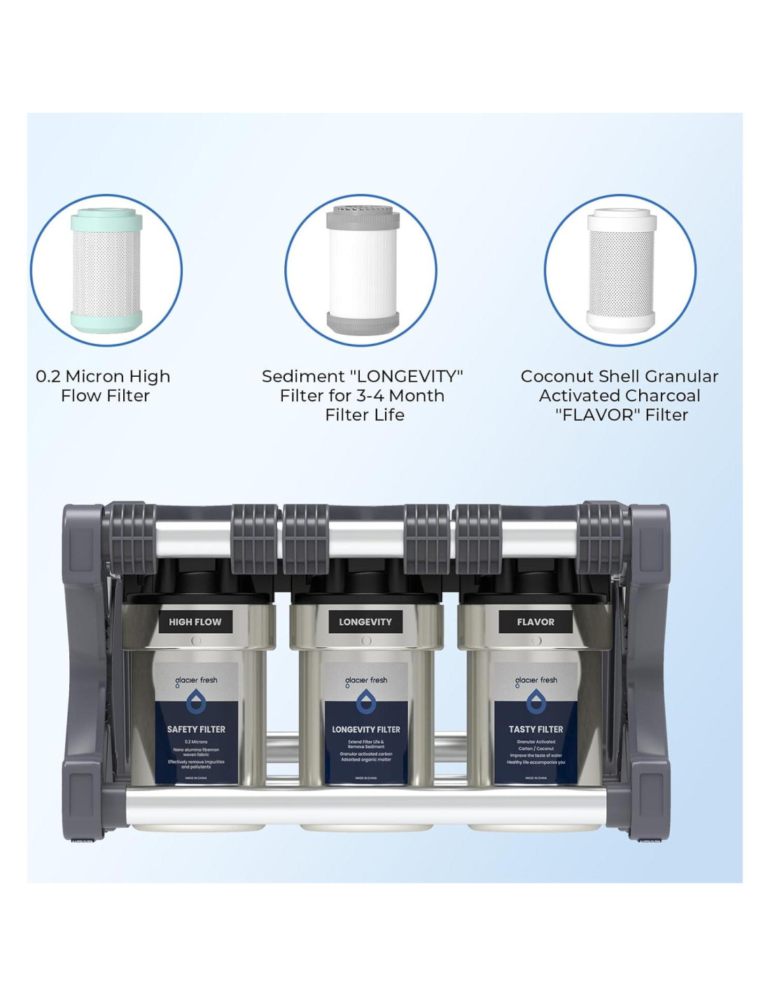 - Filtración confiable: el sistema de filtración de agua de 3 etapas cuenta con el filtro de alto flujo de 0.2 micrones de GLACIER FRESH, un filtro de carbón de cáscara de coco para mejorar el sabor, y un filtro de sedimento para extender la vida del filtro, un tamaño de micrón más pequeño significa una mayor filtración.