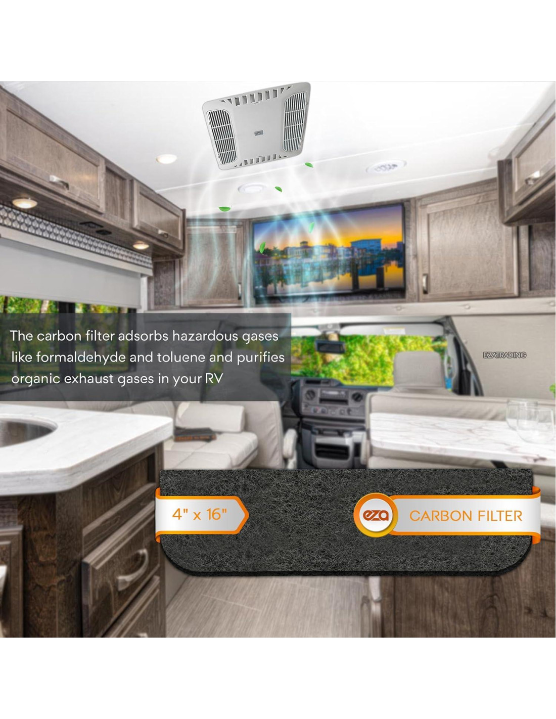 - Adsorbe gases peligrosos como el formaldehído y el tolueno y purifica los gases de escape orgánicos en su RV.