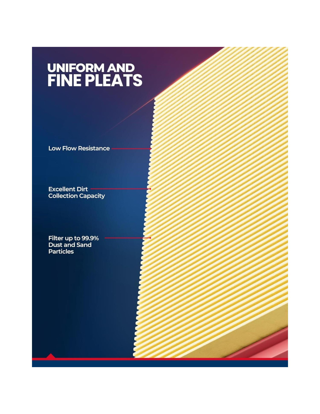 El filtro KAX utiliza papel de filtro más avanzado, la eficiencia de filtración, la capacidad de polvo y la vida útil se han mejorado considerablemente, mejor protección del motor, mejora del rendimiento del motor. El número razonable de pliegues y las tiras adhesivas de fijación adicionales le dan al filtro de aire KAX una buena estabilidad de pliegue, manteniendo los pliegues ordenados cuando el automóvil acelera o en condiciones húmedas.