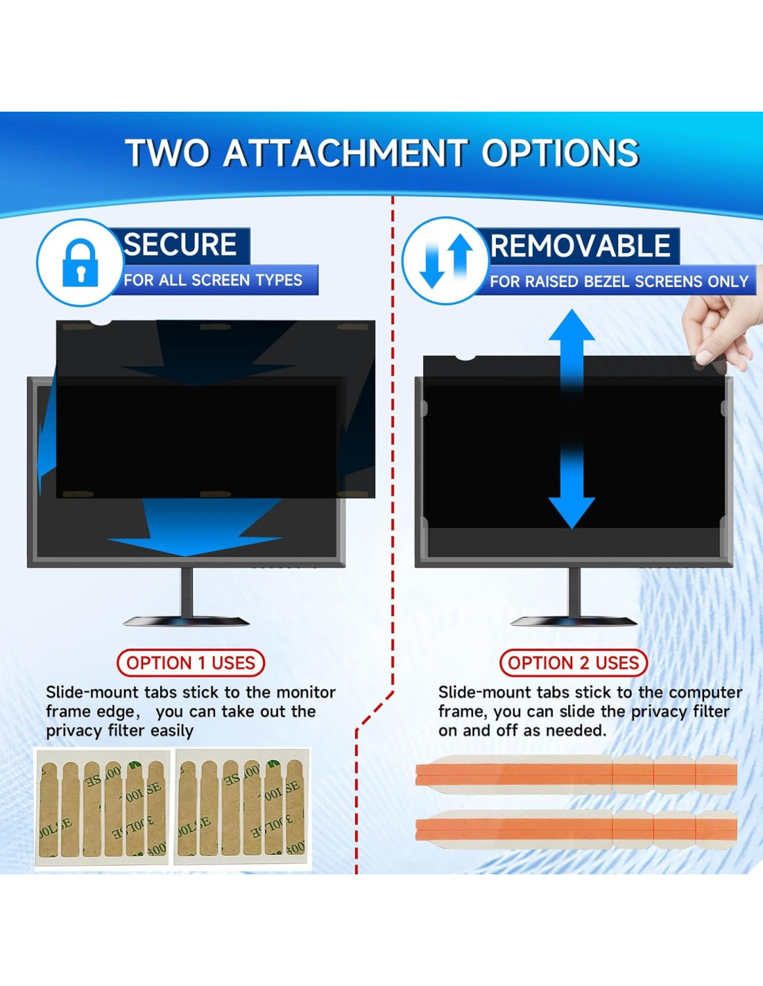 - Incluye Dos Opciones: Opción 1 utiliza tiras adhesivas transparentes que se adhieren de forma segura a cualquier pantalla de computadora. Opción 2 (solo para pantallas de computadora con un bisel elevado) utiliza pestañas de montaje deslizantes que se adhieren fácilmente al marco de la pantalla, permitiéndote deslizar el filtro de pantalla de privacidad hacia arriba y hacia abajo según sea necesario
