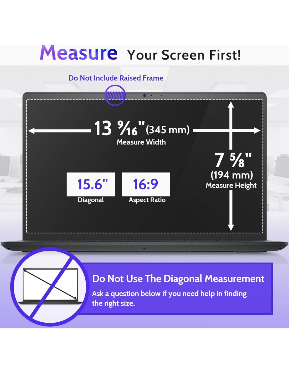 - DIMENSIONES DEL FILTRO DE PRIVACIDAD: Ancho: 13 9/16" (13.6 pulgadas/345 mm), Altura: 7 5/8" (7.6 pulgadas/194 mm), Diagonal: 15.6" (396.24 mm) - El filtro de privacidad oscurecido Peslv de 15.6" está diseñado para ser compatible con HP, Lenovo, Dell, Acer, Asus, Samsung, Envy, Toshiba y otras marcas de laptops de 15.6 pulgadas. Por favor, verifique las medidas de ancho y altura de su pantalla antes de ordenar. No se recomienda hacer su selección basándose únicamente en el tamaño diagonal de su pantalla.
