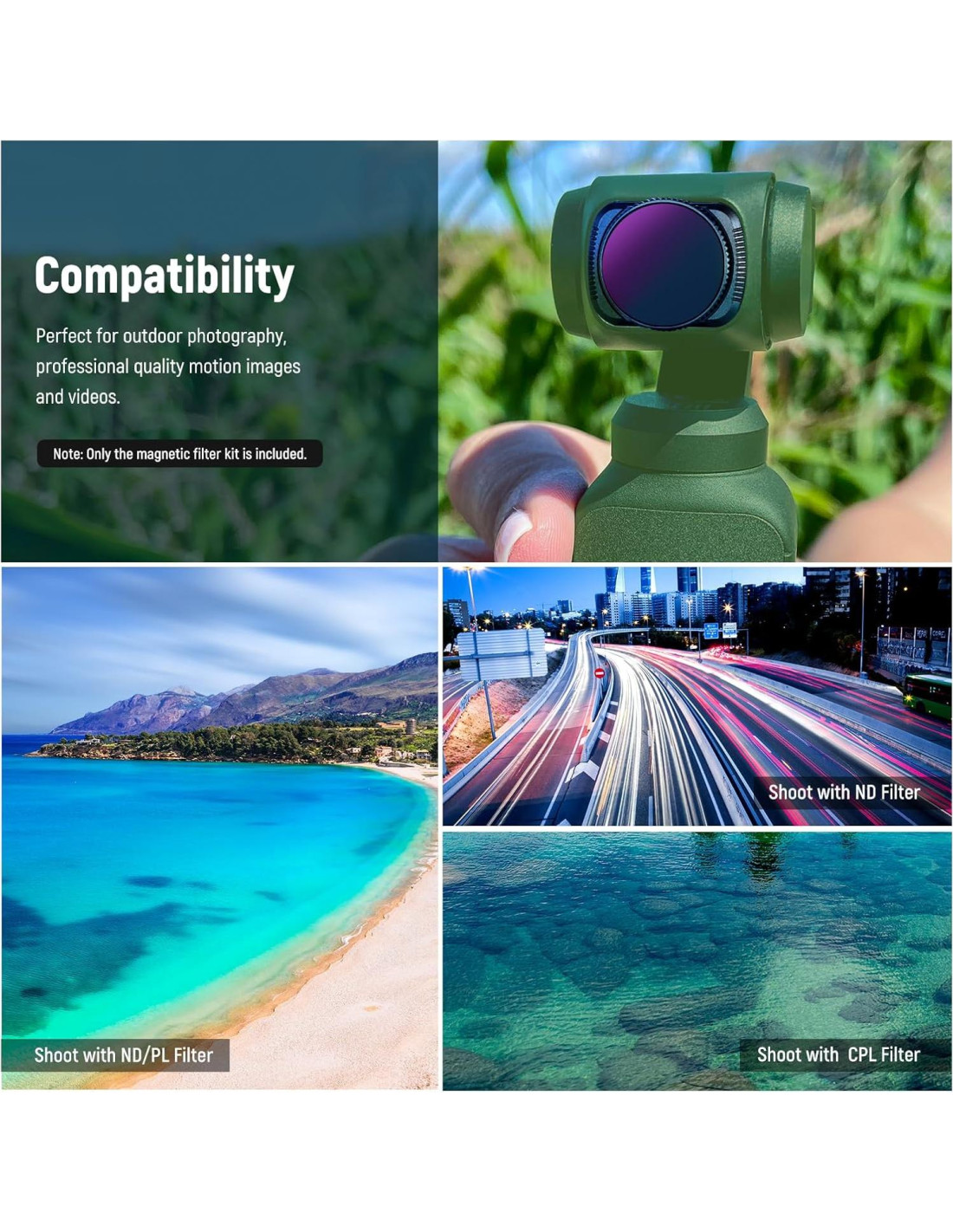 - FILTRO ND: Los filtros ND reducen la cantidad de luz que llega al sensor sin afectar el color y te permiten tener más control sobre la apertura de la cámara, el tiempo de exposición y la sensibilidad del sensor; Pueden producir una profundidad de campo más reducida, o lograr una foto más nítida. Los filtros ND/PL pueden eliminar reflejos no deseados al capturar video cinematográfico