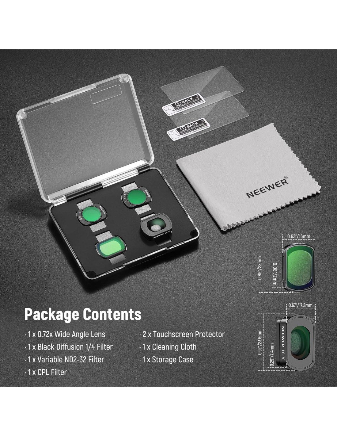 - Hecho para Osmo Pocket 3 Este juego de 4 lentes y filtros es compatible con la cámara gimbal DJI Osmo Pocket 3. Contiene tres filtros (ND2-32 variable, CPL y difusión negra 1/4) y un lente gran angular 0.72x (112 FOV). Diseñados con un rápido acoplamiento magnético, vidrio óptico HD multicapa y pesos pequeños, pueden acoplarse fácilmente al gimbal y mantener su precisión y rendimiento