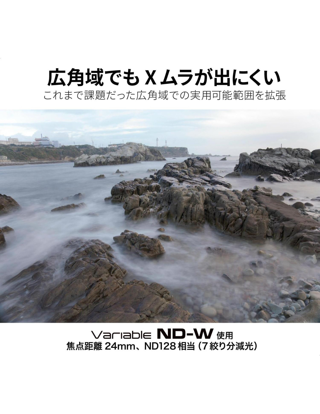 - (Se puede usar con un rango desigual de ND2.5 - ND128) El Variable ND-W tiene un amplio rango de concentración en comparación con productos convencionales, por lo que se puede usar uniformemente hasta ND128. (La concentración en sí puede atenuarse hasta cerca de ND1000, pero hará que ocurra la X desigual.)