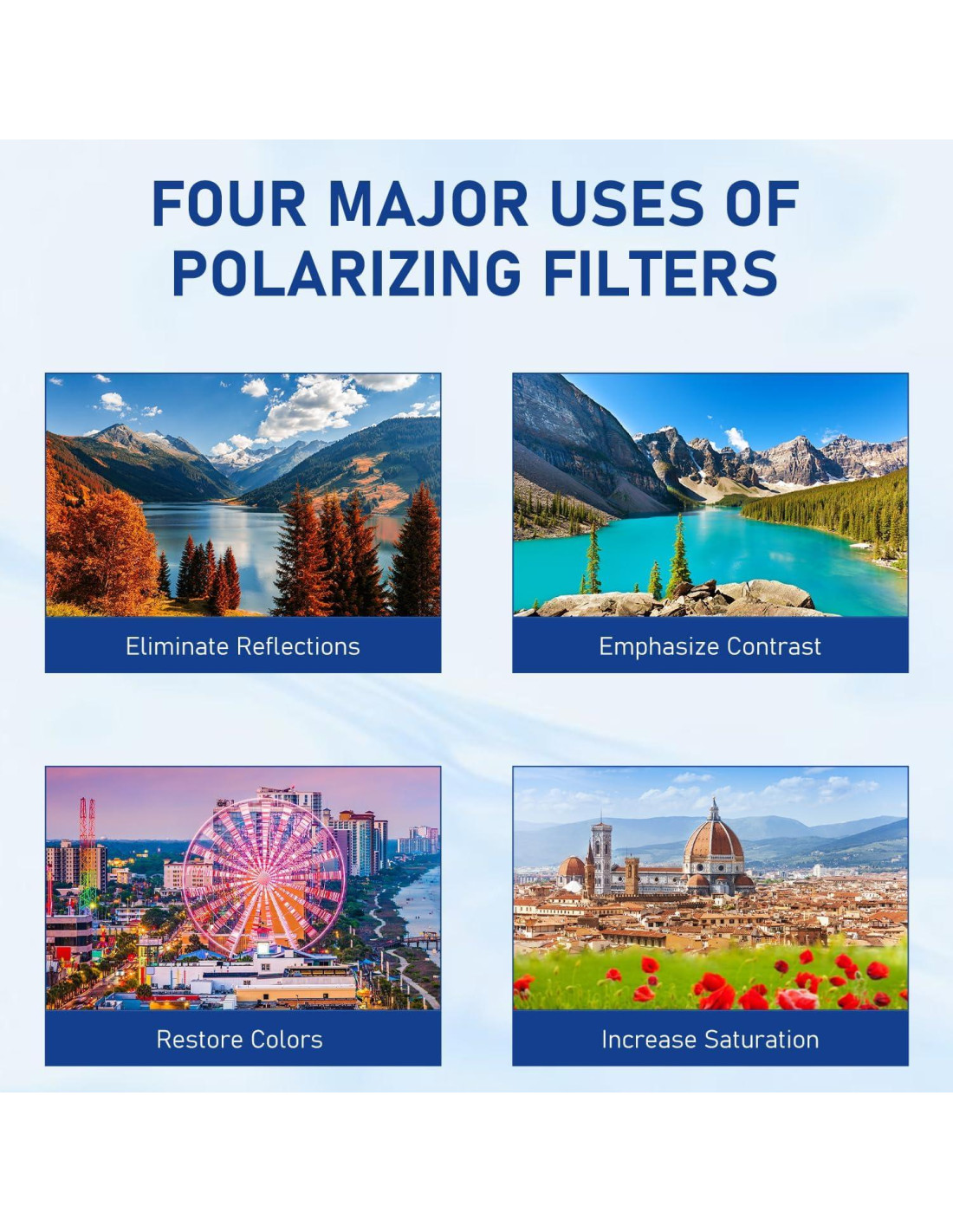 - Función del filtro CPL: Los filtros polarizadores circulares pueden eliminar reflejos de superficies no metálicas (como lagos, cielo, cascadas, vidrio, etc.) y mejorar el contraste y la saturación de la imagen, sin efecto en el color de la imagen, y restauran el color natural. Deja que tu teléfono tome fotos como una cámara SLR profesional.