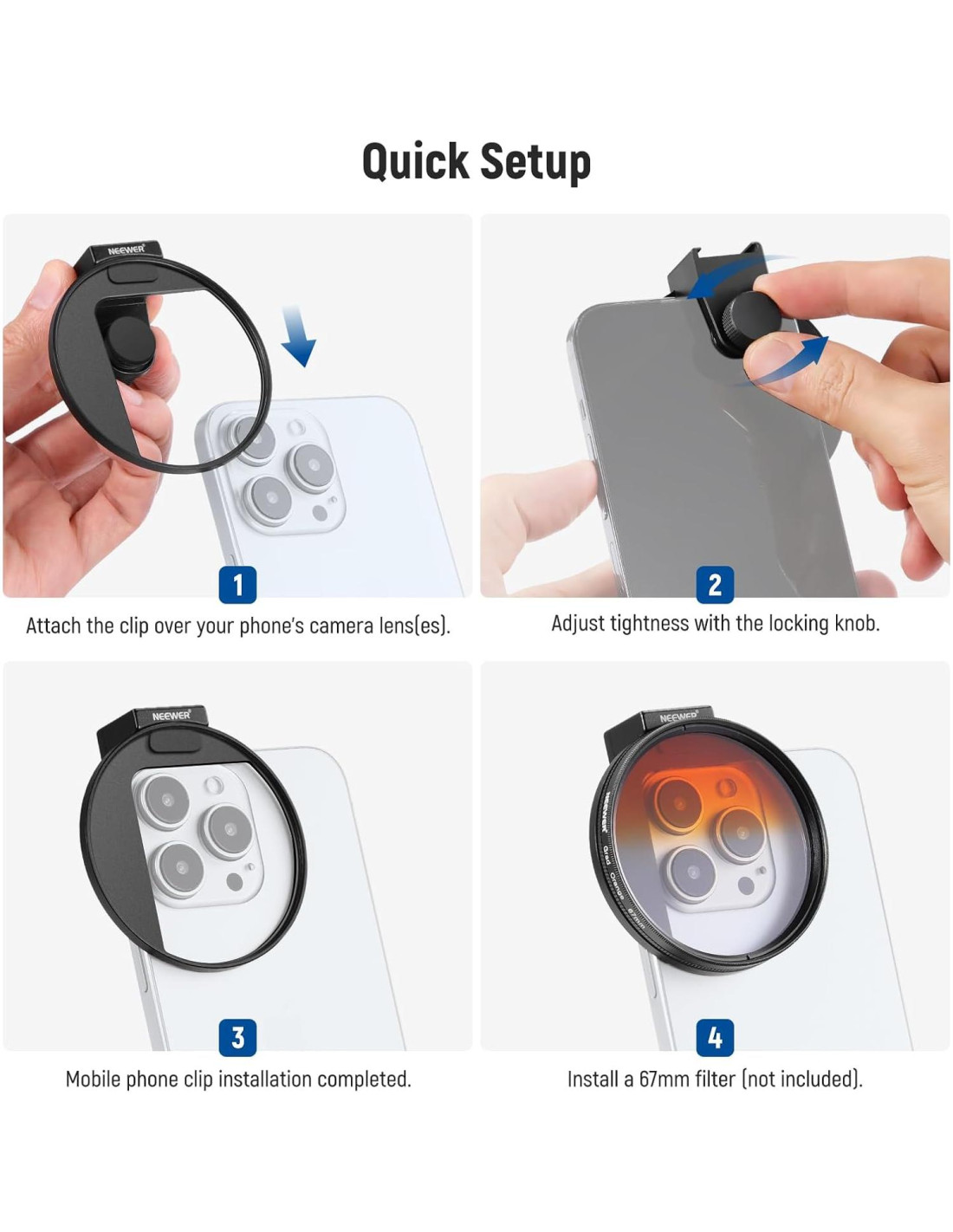 - [Clip de Filtro de Lente de Teléfono Mejorado] Este clip de filtro de lente de teléfono LA006 compatible con iPhone es un verdadero cambio de juego, ofreciendo un diseño más reflexivo para tus necesidades de fotografía, filmación, vlogging y grabación de video con accesorios de filtro. Este soporte de filtro de cámara para teléfono puede acomodar todas las lentes en la mayoría de los smartphones y funciona sin problemas con cualquier filtro de lente de cámara estándar con un rosca de 67mm
