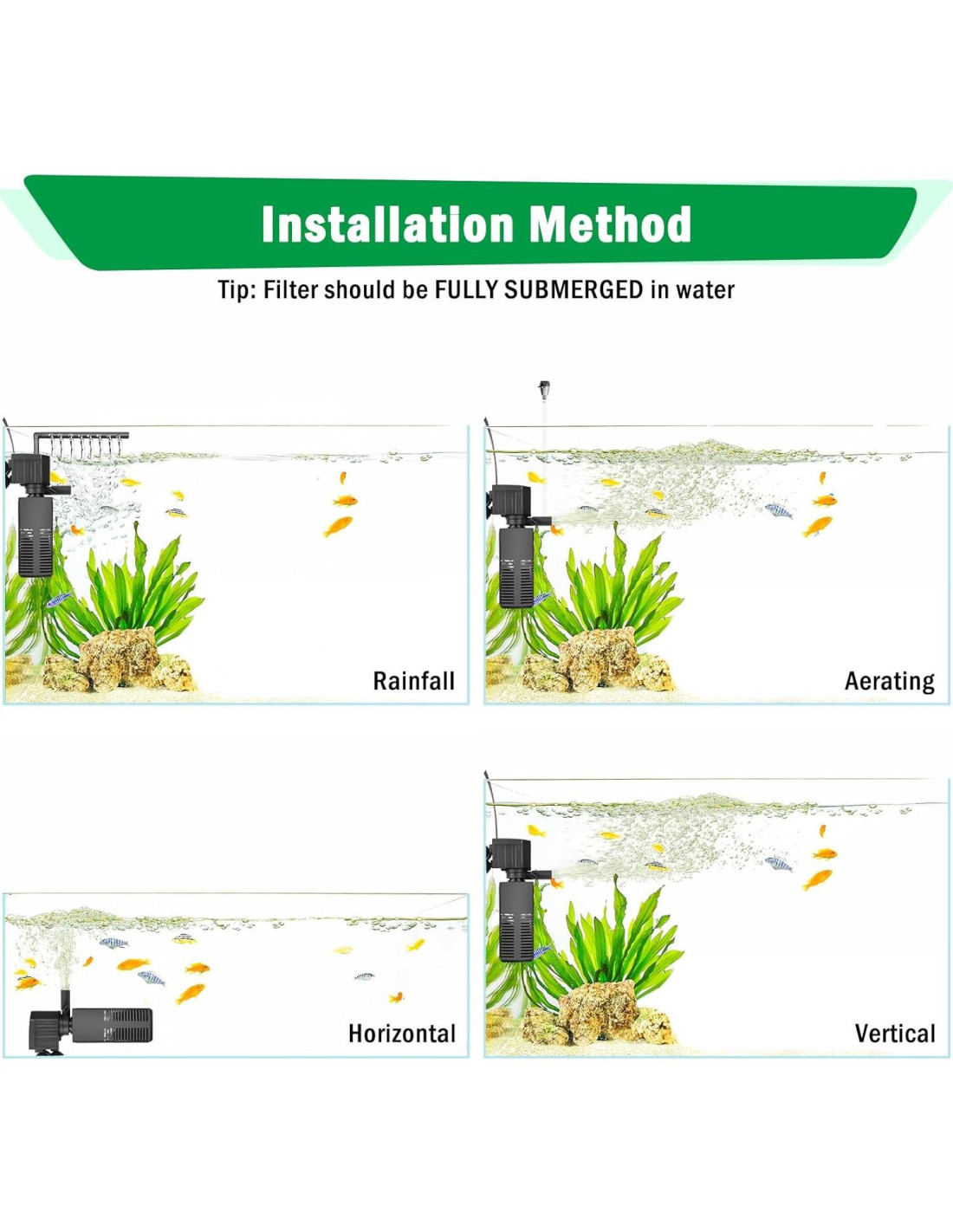 - 1 Multi-Función de Circulación de Agua: Combina la creación de olas, oxigenación, ducha de lluvia y ciclo de agua para imitar hábitats naturales. Ajusta la intensidad del flujo (0-115GPH) y la salida de aire para condiciones ideales del tanque.