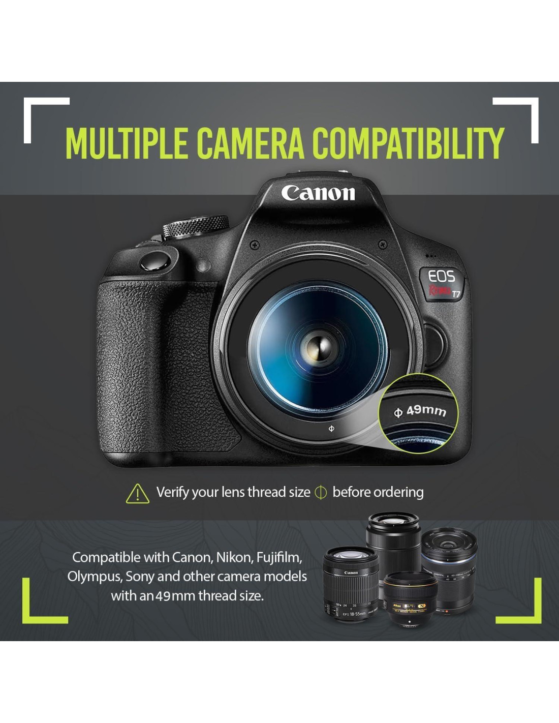 - Este paquete incluye: Lente Gran Angular de 49MM .43x + Lente Telefoto de 49MM 2.2X + Kit de Filtros de 49MM 3PC + Filtros de Primer Plano de 49MM 4PC + Capucha de Lente Tulipán de 49MM + Capucha de Lente Suave de 49MM + Tapa de Lente de 49MM + Sujetador de Tapa + Paño de limpieza de microfibra