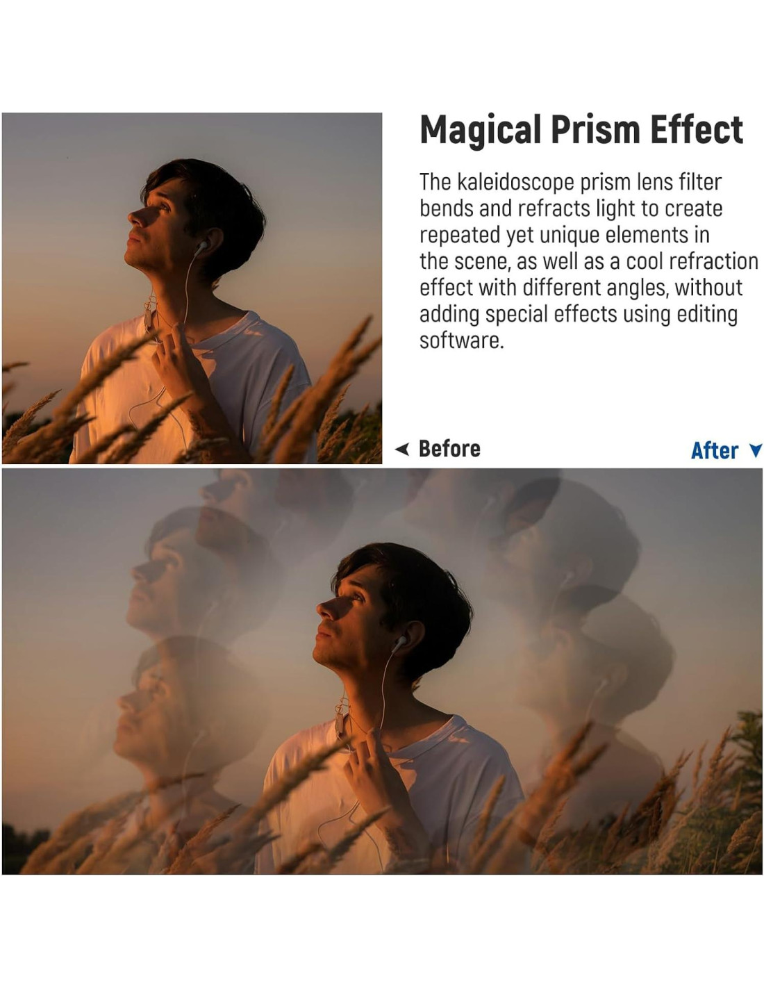 - Vidrio Óptico de Alta Transparencia Hecho de vidrio óptico premium, este filtro transmite luz con alta resolución para entregar imágenes nítidas y claras con geniales efectos de caleidoscopio. Nota: evitar disparar directamente a la luz brillante para prevenir daños potenciales a los sensores CMOS, iris de la lente y otros componentes debido a altas temperaturas.