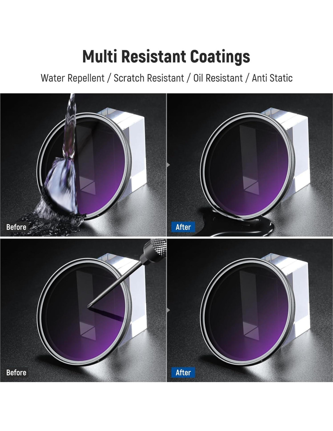 - [Ajuste ND Preciso] Gira el dial marcado para lograr valores ND precisos desde ND2 hasta ND400 (1 a 9 pasos) para una exposición óptima. Nota: Los filtros ND variables operan sobre principios de polarización. En la apertura máxima, ciertos lentes y longitudes focales pueden causar un patrón en X debido a la interacción del filtro.