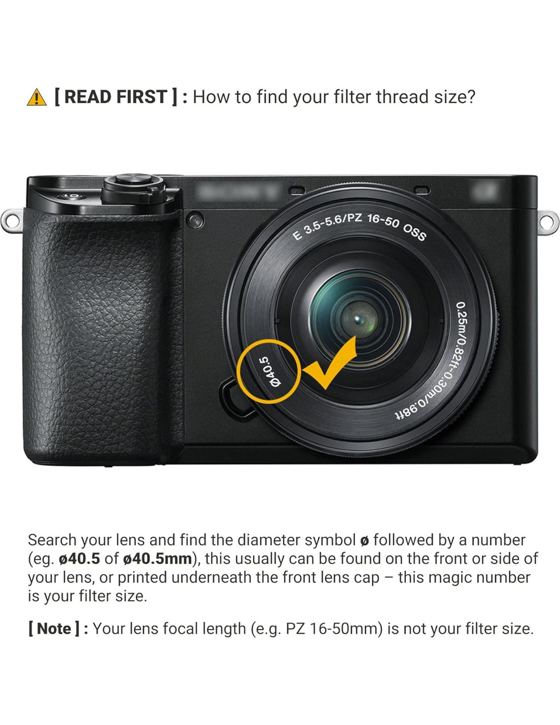 - Compatible con cualquier lente con rosca de filtro de 40.5mm de diámetro - Este filtro ND1000 es de doble rosca, tiene rosca interna de 40.5mm (macho) y rosca externa de 40.5mm (hembra), este diseño te permite colocar cualquier accesorio de rosca de 40.5mm como tapa de lente, parasol de lente de tipo atornillable en la parte frontal del filtro