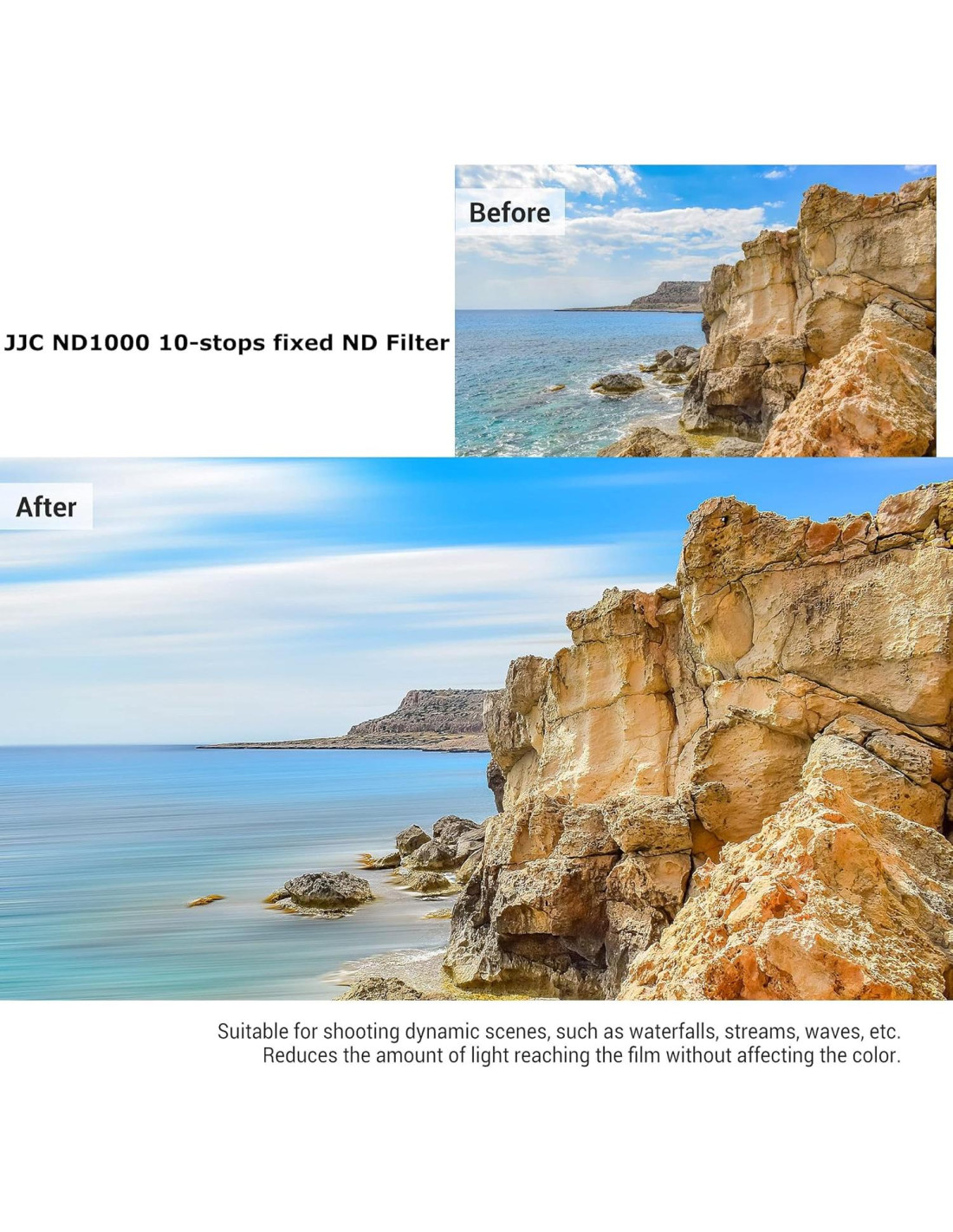 - No afecta la coloración de la imagen y es ideal para combinar con otros filtros, a diferencia de un filtro ND variable que podría causar marcas de cruz en X, viñeteo, reflejos o desenfoque en la imagen al usar lentes gran angulares en valores ND más altos, este filtro de densidad neutra fijo ND1000 de 10 paradas no tiene este tipo de problema.