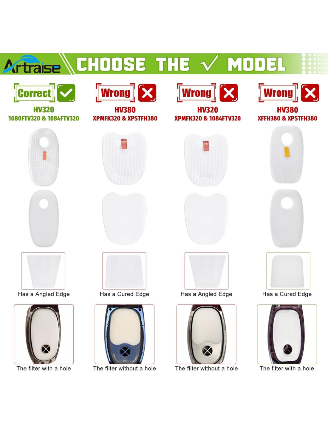 - Por favor, tenga en cuenta: Rocket tiene dos versiones de estas aspiradoras de la serie HV320, HV320W, HV321, HV322, HV324Q, UV330, UV422 que utilizan diferentes filtros de espuma y fieltro. Si sus filtros de espuma y fieltro tienen un agujero, estos son los correctos.