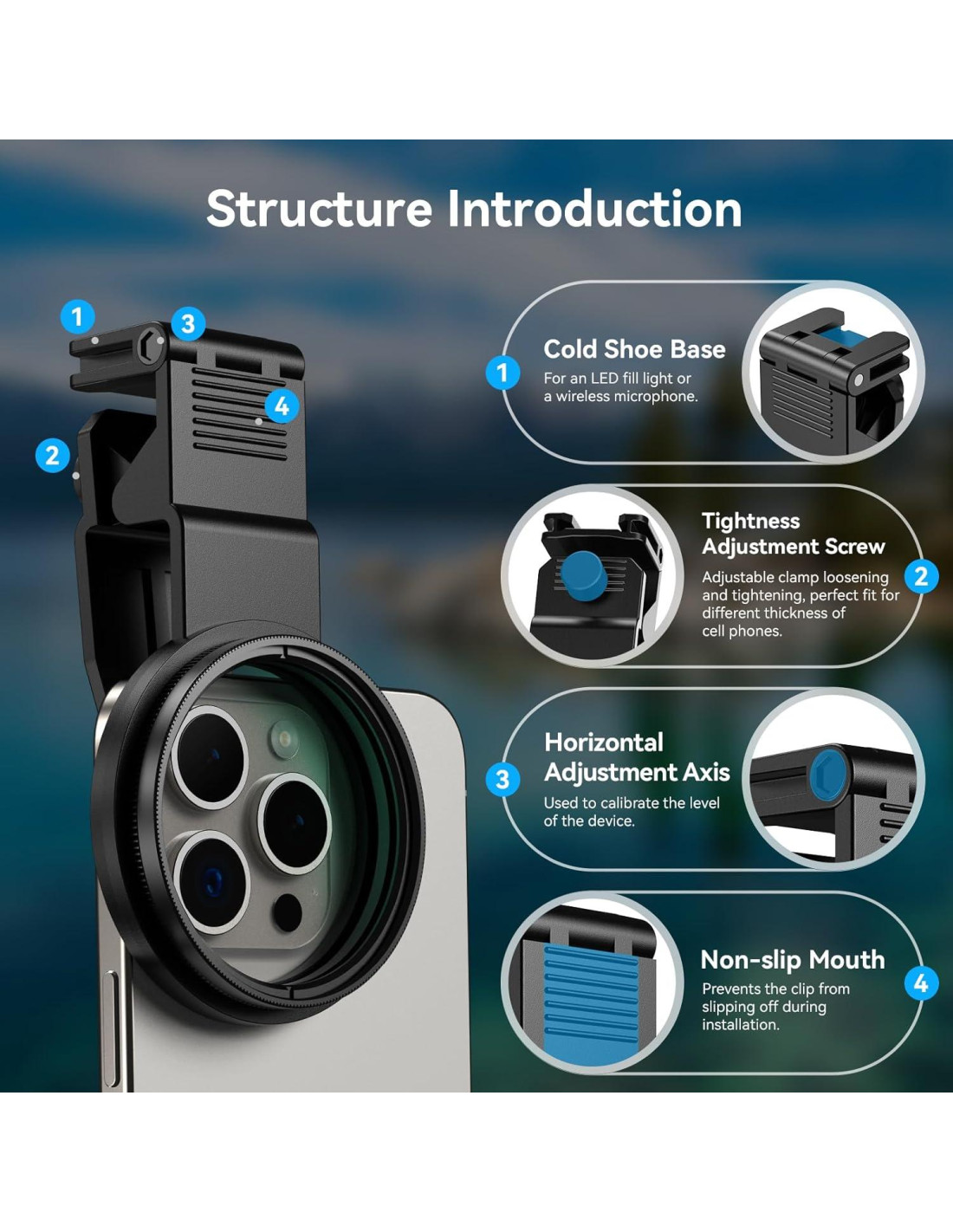 - Juego de Filtros para Lente de Cámara de Teléfono Móvil: Este conjunto de accesorios de filtro de 58mm incluye 4 filtros de color graduado (rojo, naranja, amarillo y azul), un filtro polarizador circular, un filtro ND32, un filtro de estrella de 6 puntos y un clip para lente de teléfono móvil (con Montura Fría). Este accesorio es adecuado para la mayoría de los teléfonos móviles y una variedad de cámaras. Compatible con iPhone 16 15 14 13 12 11 Pro Max Plus, Samsung S25 S24 S23 S22 Ultra, compatible con cámaras DLSR con lente de 58mm.
